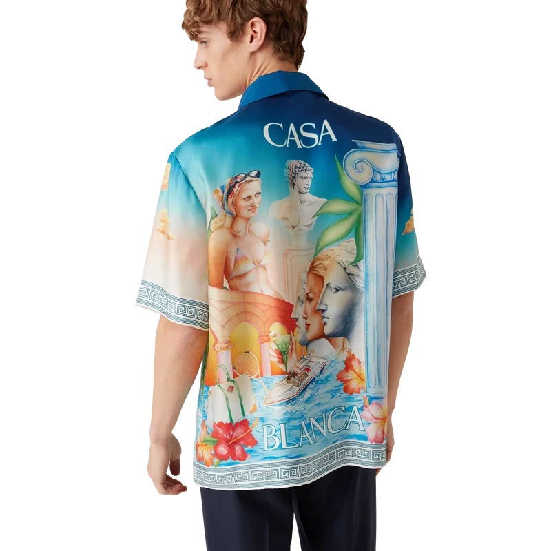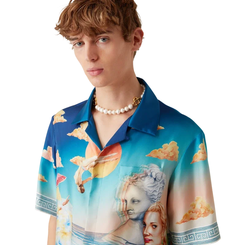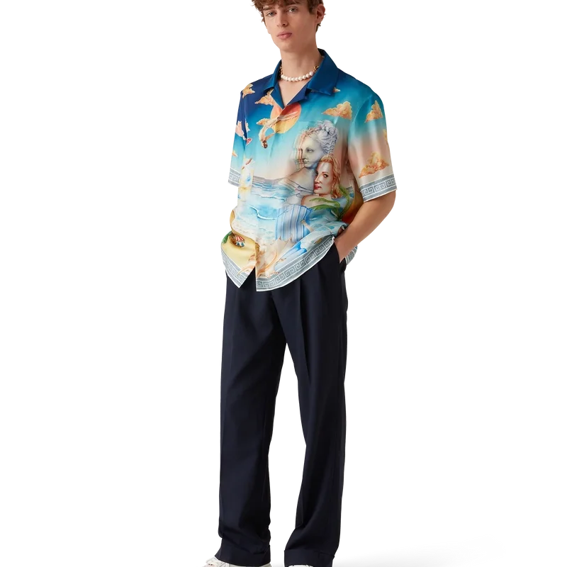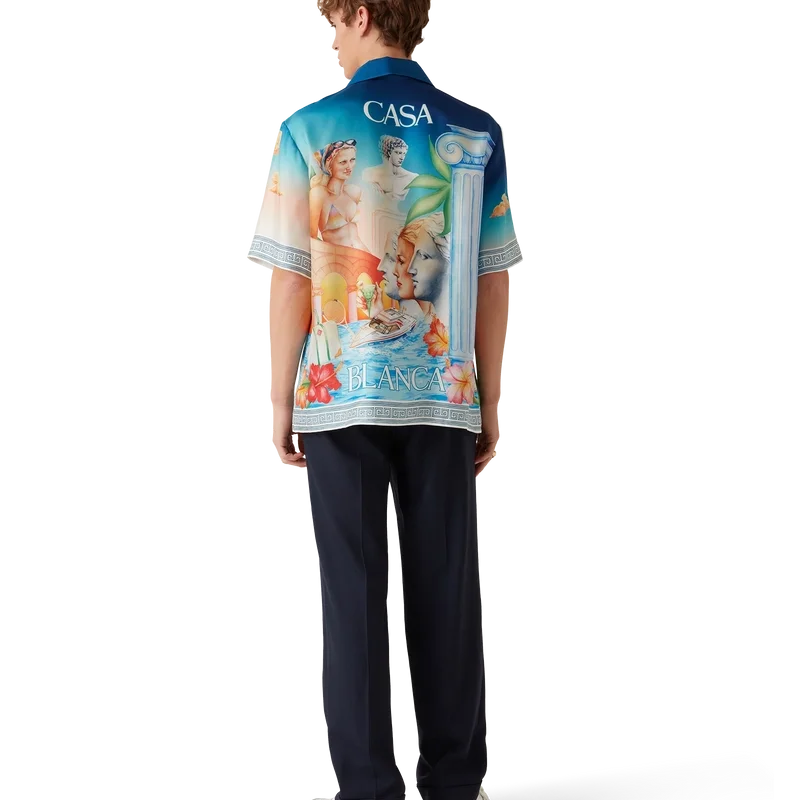 Cămașa din mătase Le Plongeon este un model cu mâneci scurte și imprimeu pe toată suprafața, confecționată dintr-o țesătură din sârgă de mătase, cu imprimeul sezonier al casei, inspirat de studiul continuu al frumuseții clasice și al farmecului contemporan al Greciei antice, încorporând elementele de design ale casei. Completată cu nasturi din corozo cu logo-ul Cc intercalat, închidere cu nasturi, guler cubanez și buzunar la piept.