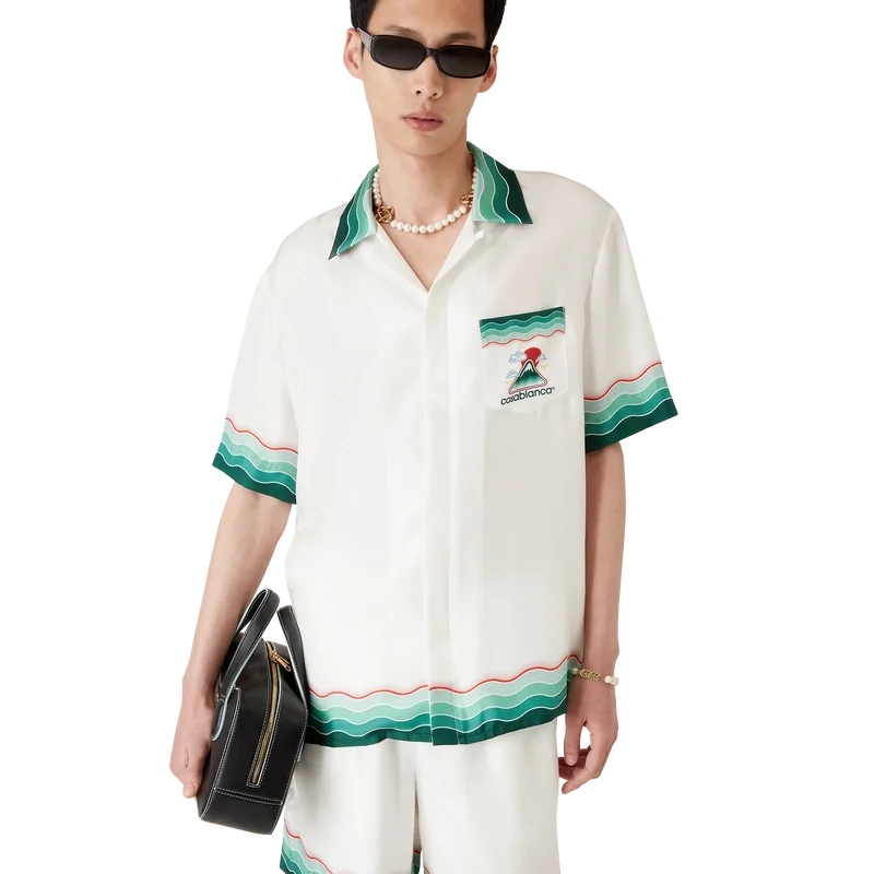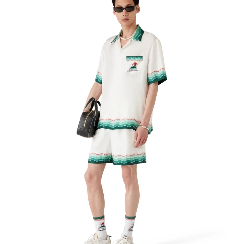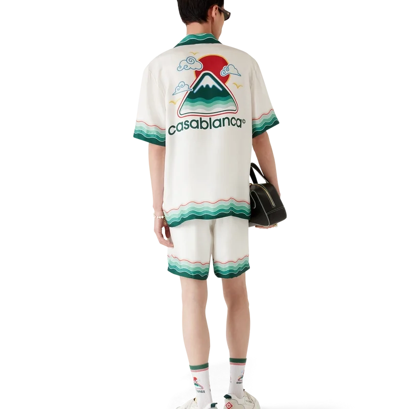 Cămașa din mătase Montagne Ondulee este un model cu mâneci scurte și imprimeu integral, care prezintă grafica sezonieră a casei de modă – folosind bogata iconografie japoneză ca sursă de inspirație pentru această colecție, cu un layout și o grafică simple, care transmit un mesaj vizual puternic cu doar câteva linii și culori, făcând-o una dintre emblemele colecției – confecționată din țesătură de mătase twill. Completată cu guler cubanez, închidere cu nasturi ascunși, nasturi din corozo cu logo-ul Cc intercalat și detalii cu dungi inspirate de valurile Memphis pe guler, manșete și tiv.
