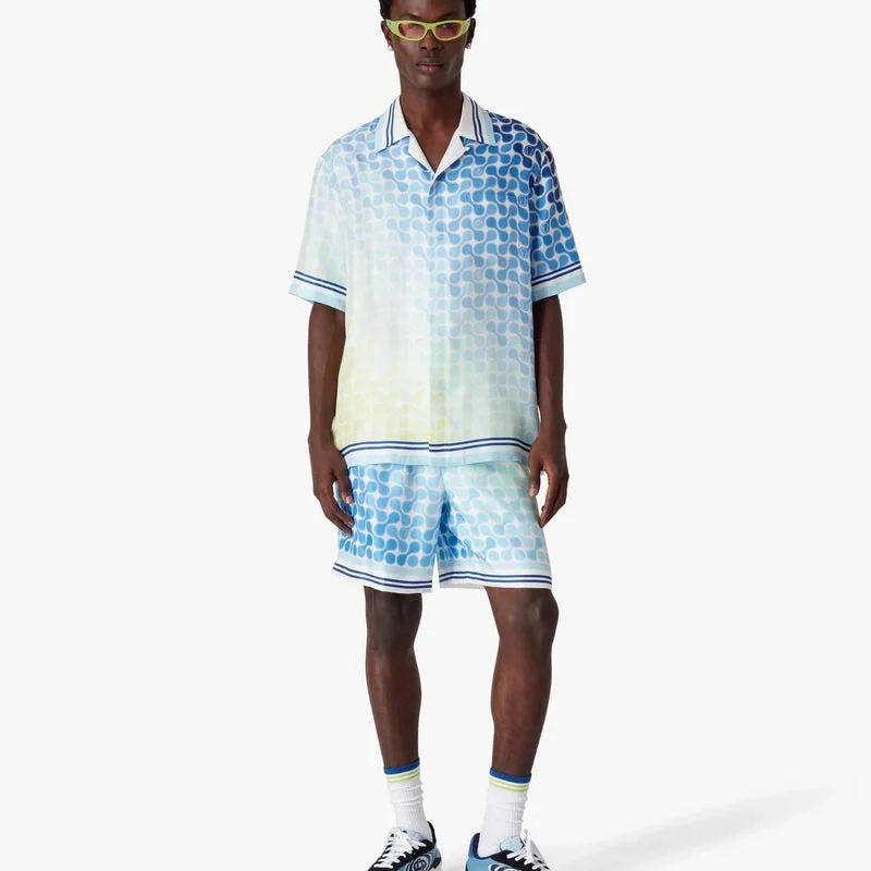 Cămașa din mătase cu mâneci scurte și imprimeu Tennis Tile are un design imprimat pe toată suprafața, prezentând grafica sezonului cu un model care urcă și coboară lin, format din logo-uri și mingi de tenis care se intersectează, amestecate cu gradientul sezonier. Completată cu guler în stil cubanez, închidere cu nasturi, nasturi din corozo cu logo-ul Cc intercalat, buzunar la piept și detalii cu margini în dungi la guler, manșete și tiv.