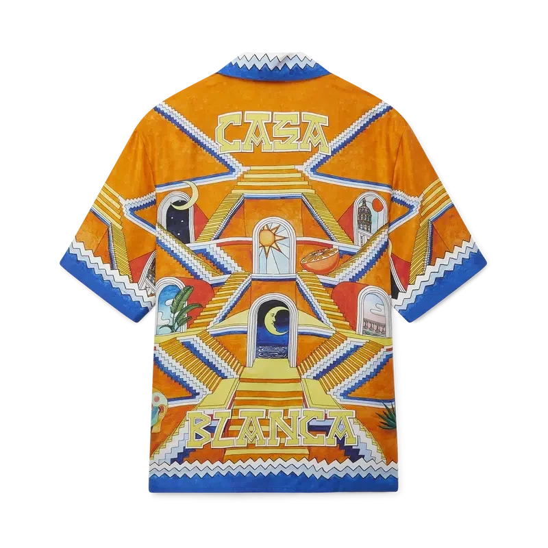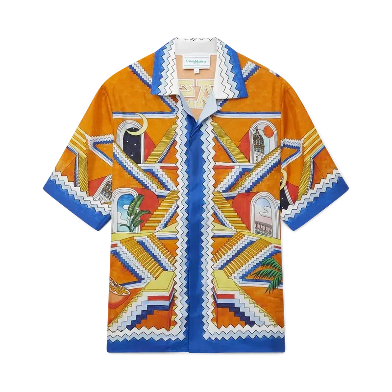 Cămașa din mătase Escalier Infini este un model cu mâneci scurte și imprimeu, prezentând grafica radiantă a scării fără sfârșit care populează colecția de primăvară/vară 2023. Finisată cu un guler în zig-zag albastru și alb contrastant și închidere deschisă la guler. Această cămașă a fost croită pentru o croială mai conturată.