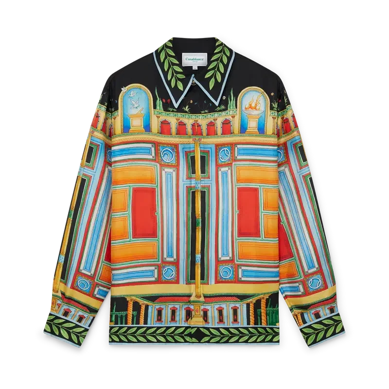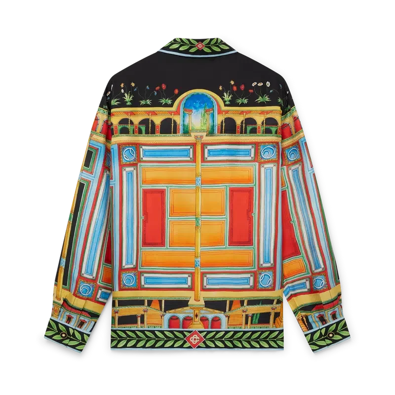 Cămașa din mătase Le Palais En Fleur este un model cu mâneci lungi și imprimeu integral, prezentând un design sezonier inspirat de istoria arhitecturală a Pompeiului, culorile sale vibrante și simetria, confecționată dintr-o țesătură din mătase twill. Completată cu nasturii cu margini aurii și perle, caracteristici ale casei, închidere cu nasturi, guler cubanez și motivul caracteristic cu frunze de laur pe manșete, tiv, guler și placket.