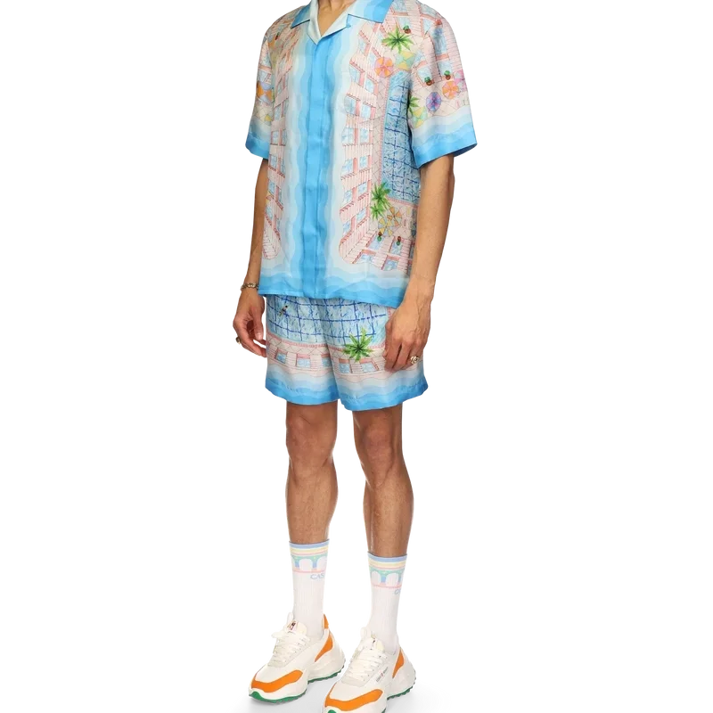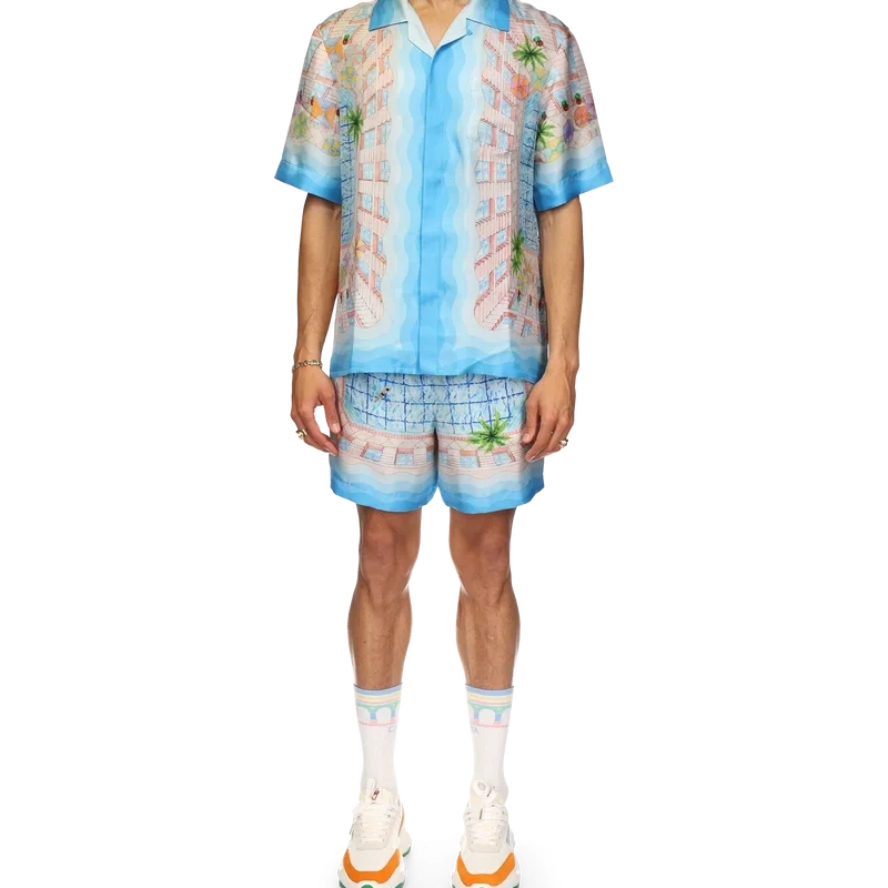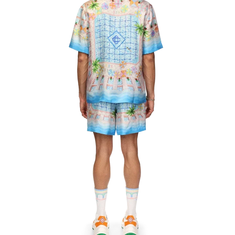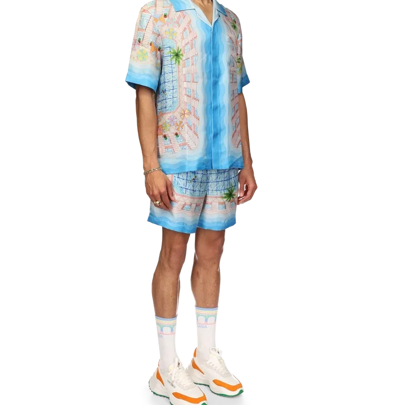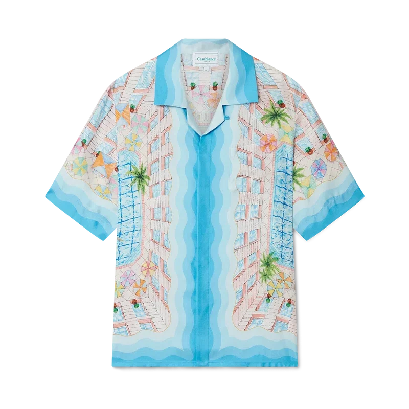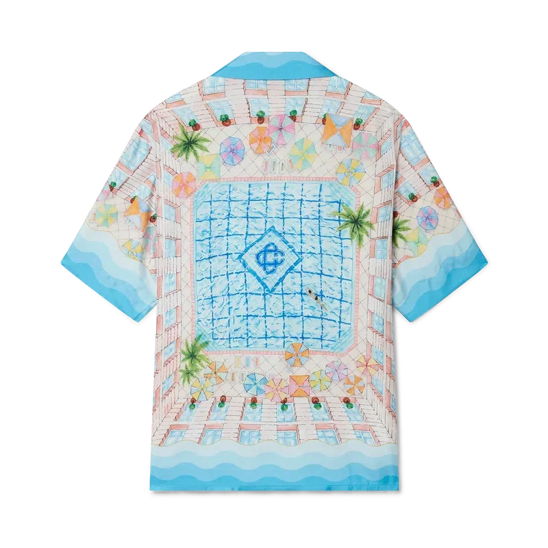 Cămașa din mătase Le Plongeon este un model cu mâneci scurte și imprimeu, confecționată dintr-o țesătură din twill de mătase, cu un motiv sezonier inspirat de o zi frumoasă la piscina hotelului și de idealismul călătoriilor privit de sus – oferind o nouă perspectivă. Paleta de culori este deschisă și idealistă, cuprinzând nuanțe pastelate delicate. Cămașa este prevăzută cu închidere cu nasturi în față, guler cubanez, buzunar la piept și detalii cu dungi în degrade, inspirate de valurile Memphis, pe manșete, guler, tiv și placket.