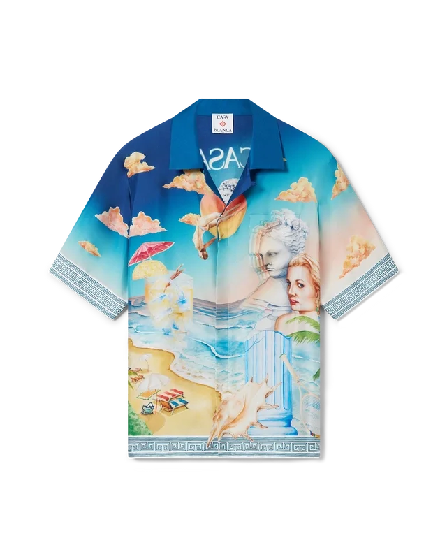 Cămașa din mătase Le Plongeon este un model cu mâneci scurte și imprimeu pe toată suprafața, confecționată dintr-o țesătură de mătase twill, cu imprimeul sezonier al casei, inspirat de studiul continuu al frumuseții clasice și al farmecului contemporan al Greciei antice, încorporând elementele de design ale casei. Completată cu nasturi din corozo cu logo-ul intercalat CC, închidere cu nasturi, guler cubanez și buzunar la piept.