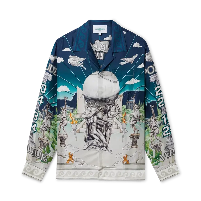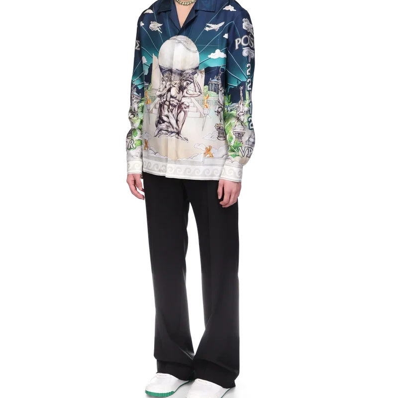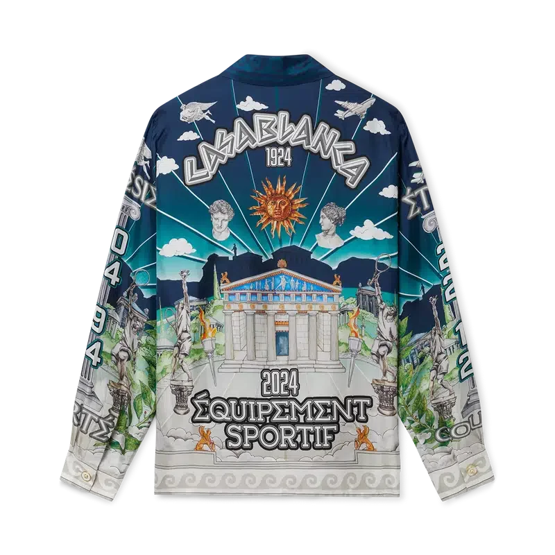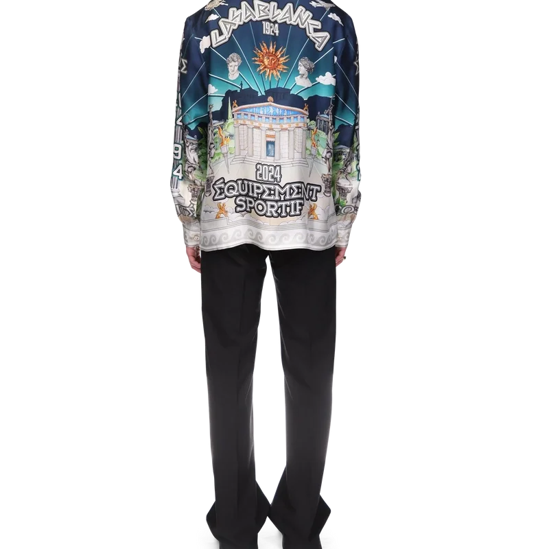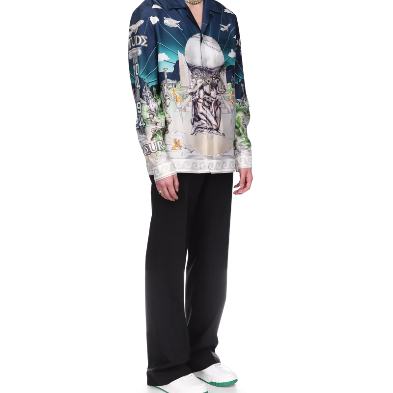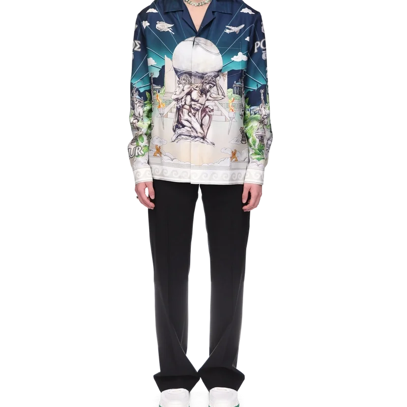 Cămașa din mătase Le Temple Du Sport are mâneci lungi și un imprimeu pe toată suprafața și face parte din colaborarea exclusivă cu Jeff Hamilton – este o interpretare a clubului nostru de tenis cu un peisaj și elemente plutitoare – confecționată dintr-o țesătură de mătase twill. Completată cu nasturii cu margine aurie și perle, semnătura casei, închidere cu nasturi, guler cubanez și detaliile de margine inspirate de valurile grecești ale acestui sezon pe guler, manșete și tiv.