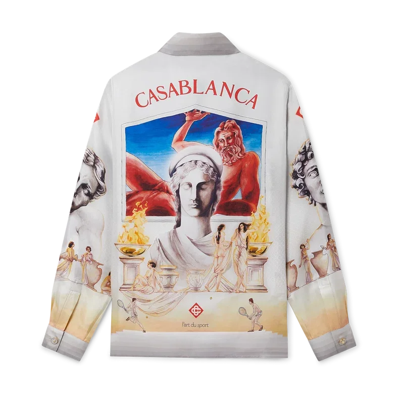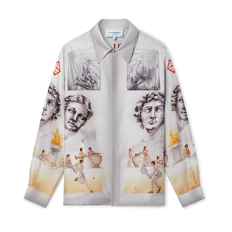 Cămașa din mătase Le Theatre este un model cu mâneci lungi și imprimeu integral, confecționată dintr-o țesătură de mătase twill, prezentând grafica sezonieră a casei de modă, inspirată de afișele de teatru vintage, care înfățișează statui din Grecia Antică și tenis, într-un layout nou și proaspăt. Completată cu nasturi cu margini aurii și perle, semnătura casei, închidere cu nasturi, guler cubanez și detalii cu dungi în degrade pe manșete, tiv, guler și placket.