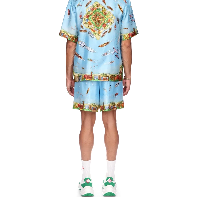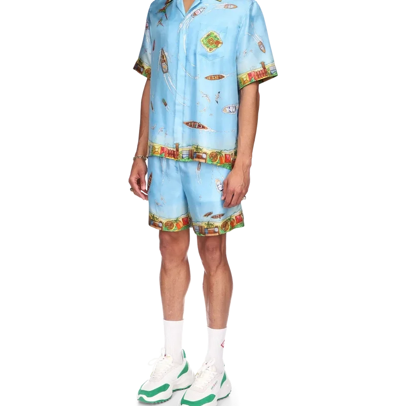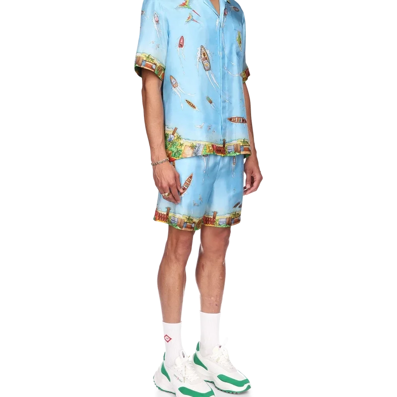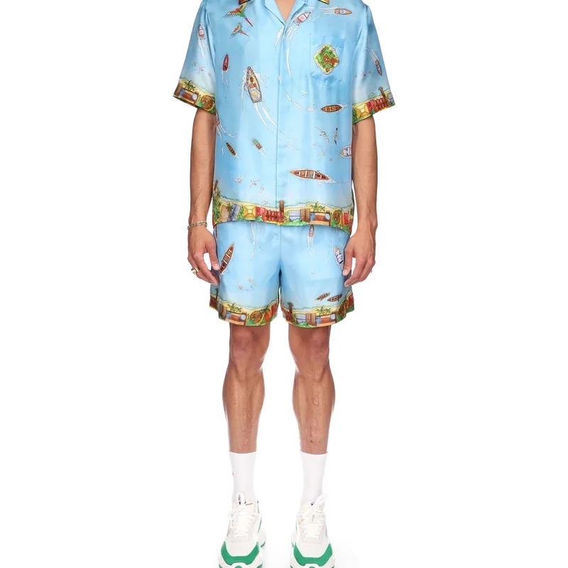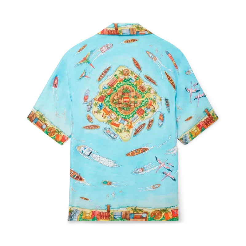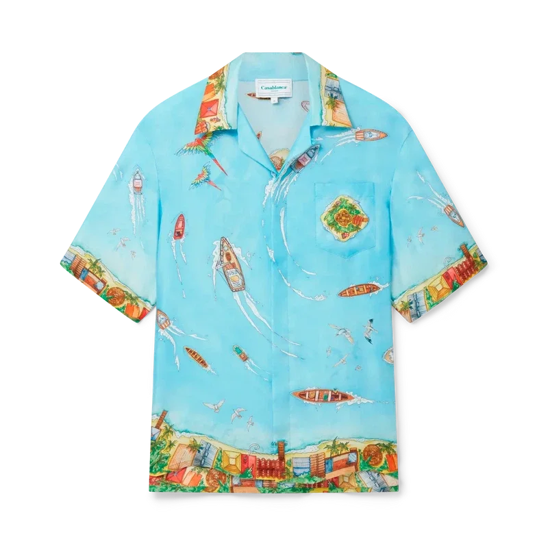 Cămașa din mătase Maison Sur Piloti este un model cu mâneci scurte și imprimeu integral, inspirat de satele plutitoare din Lagos, de comunitate și de energia, mișcarea circulară a bărcilor, culorile și contrastul dintre lemn și apă. Confecționată dintr-o țesătură de mătase twill și completată cu închidere cu nasturi, buzunar la piept și guler cubanez deschis.