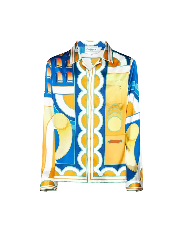 Cămașa din mătase Paysage este un model cu mâneci lungi și imprimeu, prezentând o versiune abstractă a imprimeului sezonier Arch, redat într-o selecție de nuanțe reci de albastru închis și galben și portocaliu cald. Confecționată din 100% mătase, cămașa este concepută pentru a avea o croială lejeră, cu guler în stil cubanez destinat a fi purtat deschis.