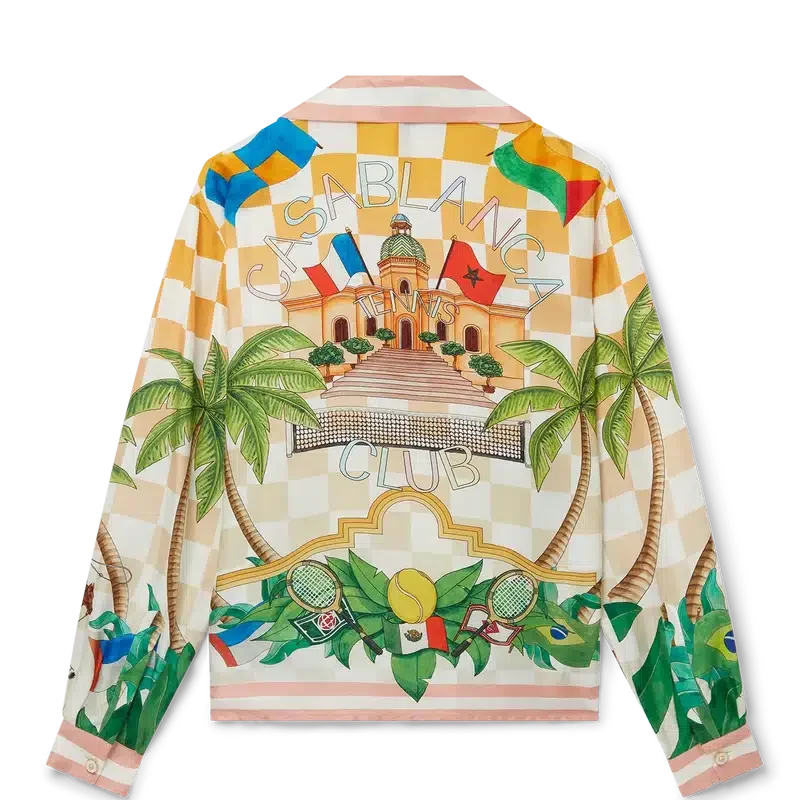 Cămașa din mătase cu guler cubanez Tennis Club este un model cu mâneci lungi și imprimeu, care reinterpretează în stilul sezonului grafica emblematică Tennis Club a casei de modă. Prezintă guler deschis, închidere cu nasturi în față și buzunar la piept și este concepută pentru o croială clasică.