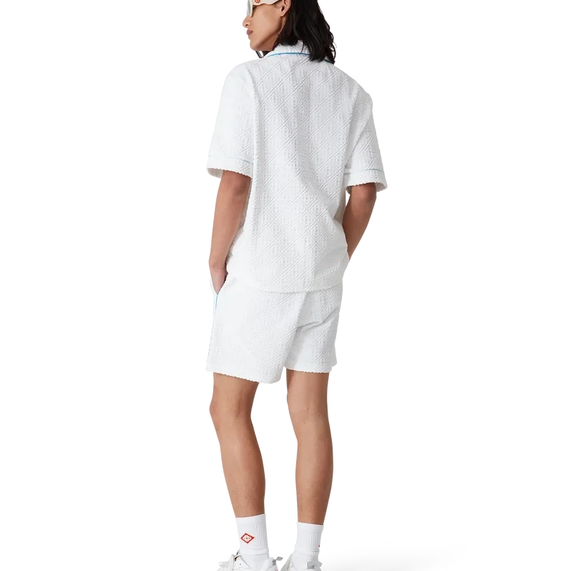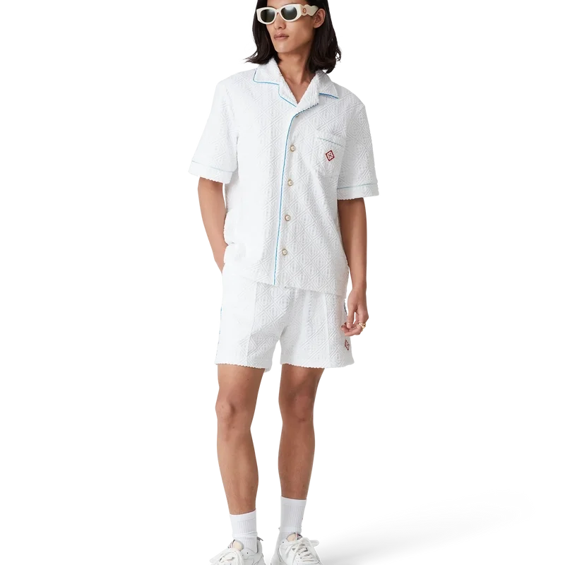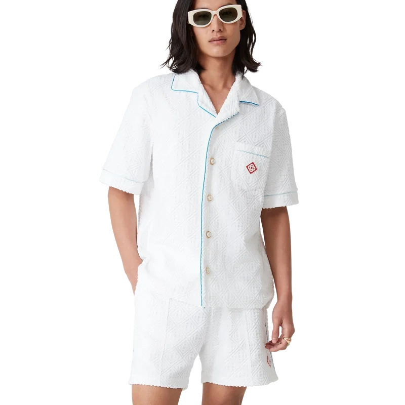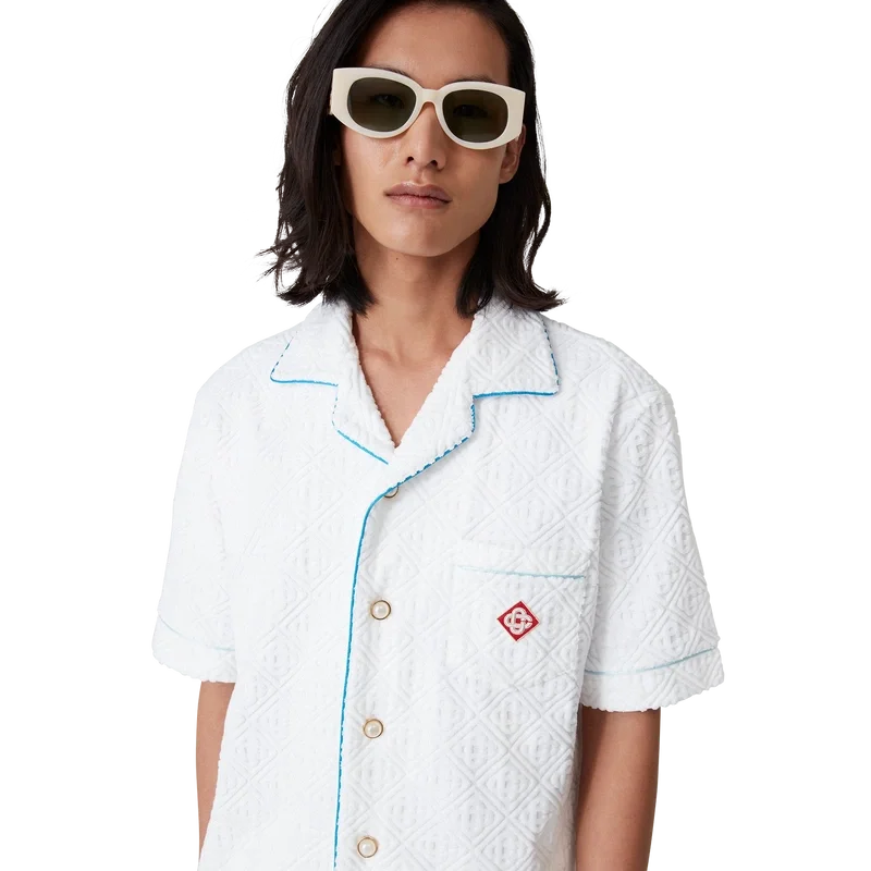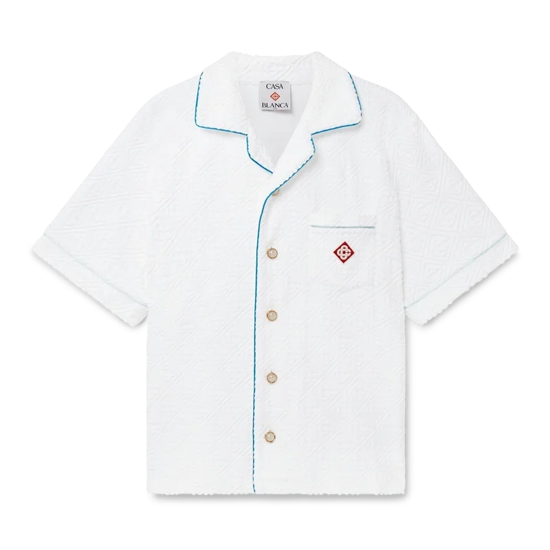 Cămașa din material de prosop cu dungi de tenis este un model cu mâneci scurte, confecționat dintr-un material de prosop cu Diamond Monogram, cu logo-ul în formă de diamant al casei. Este prevăzută cu închidere cu nasturi, nasturi cu margine aurie și perle, caracteristici ale casei, un buzunar la piept și detalii cu bordură pe guler, mâneci, buzunarul de la piept și placket.