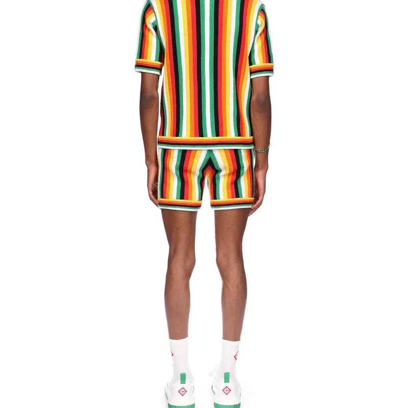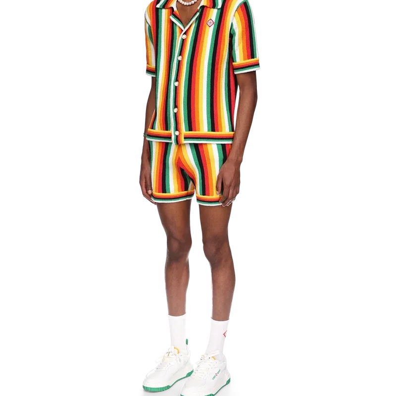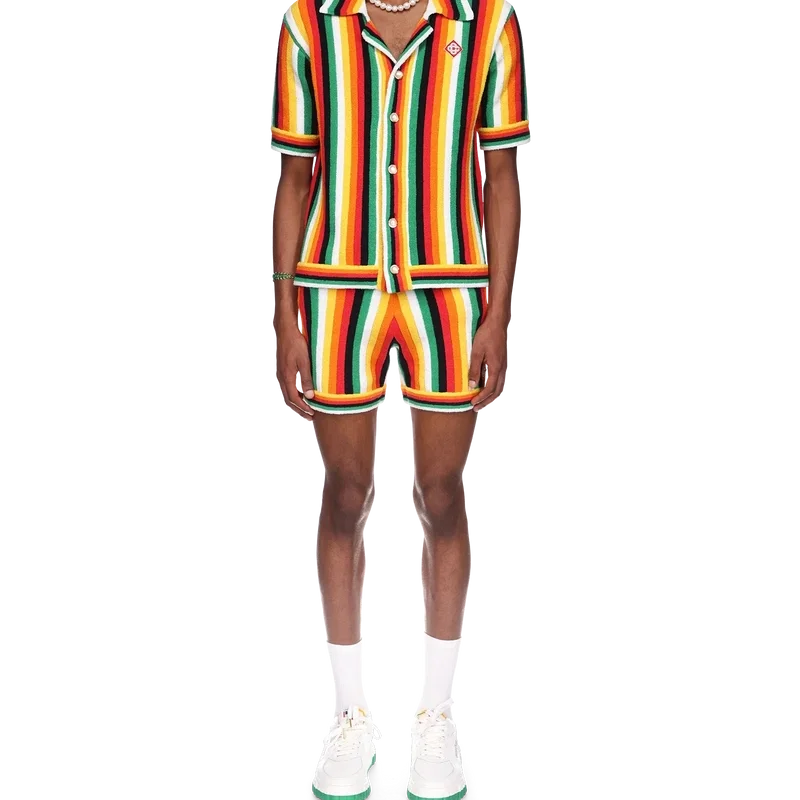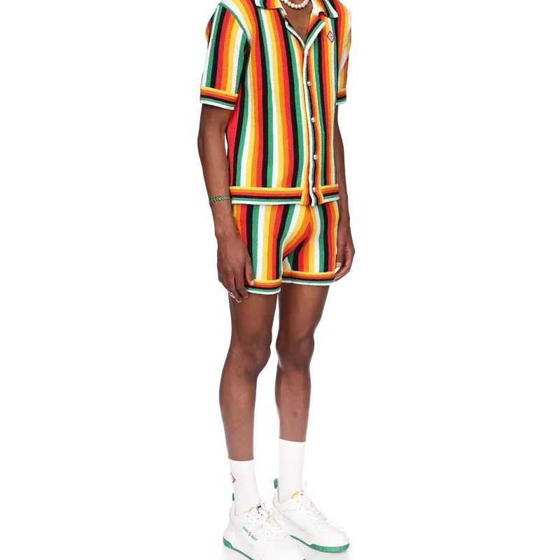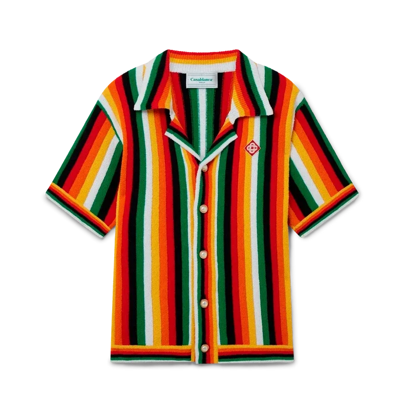 Cămașa din material de prosop cu dungi este un model tricotat, confecționat dintr-un material de prosop din amestec de bumbac și prezintă culorile sezonului, reprezentative pentru schimburile bogate dintre disciplinele culturale din arta, muzica și filmul african. Completată cu guler cu nervuri, nasturii cu margini aurii și perle, semnătura casei, și patch-ul cu logo-ul diamant, semnătura casei.