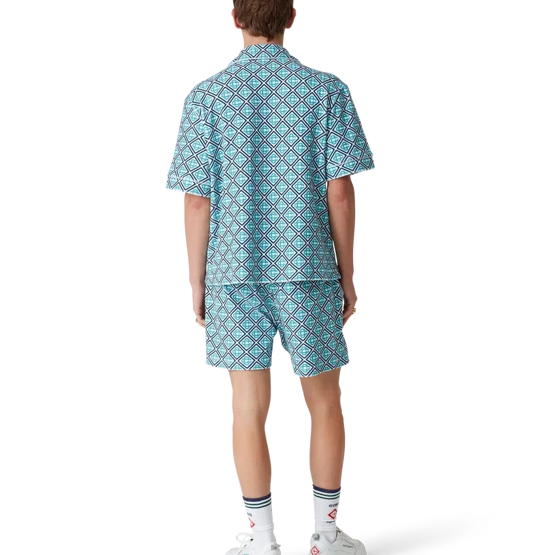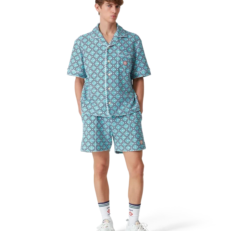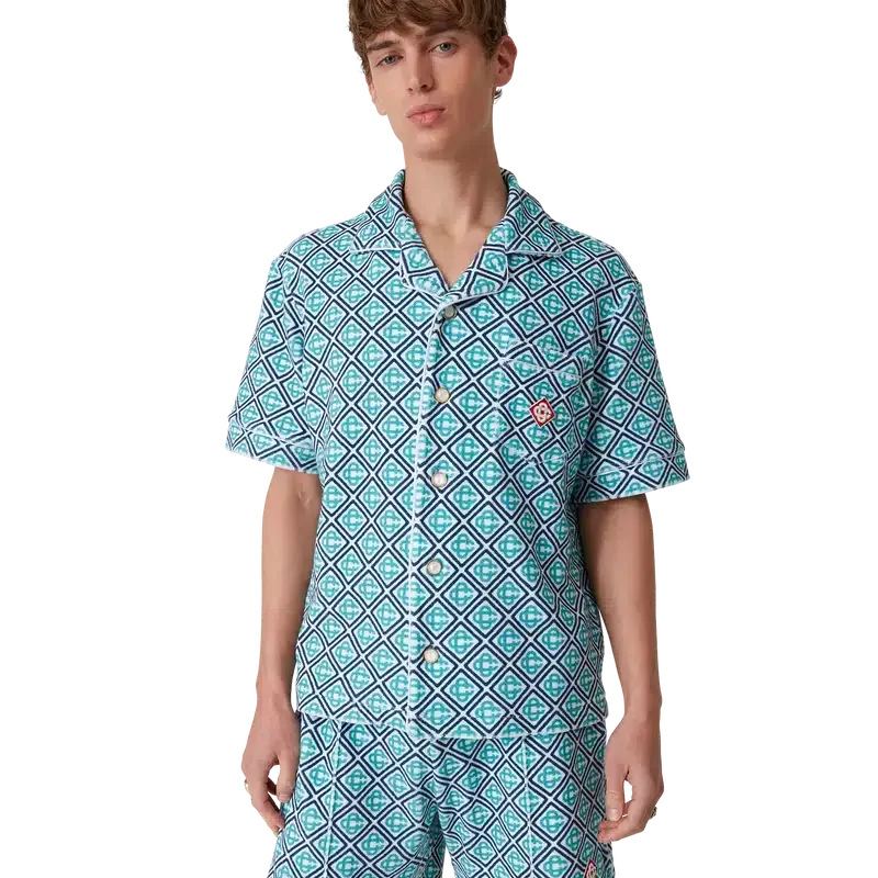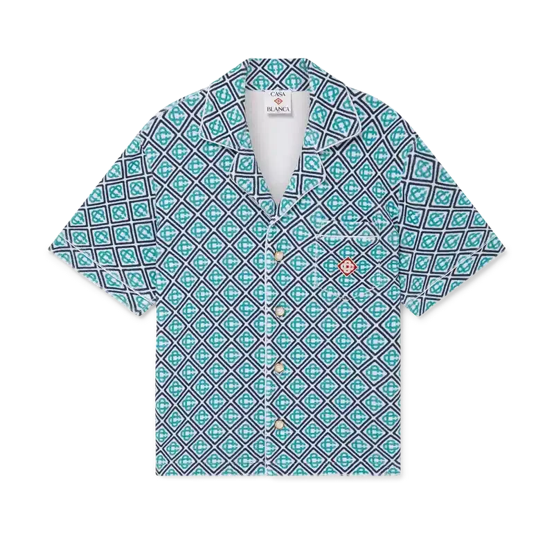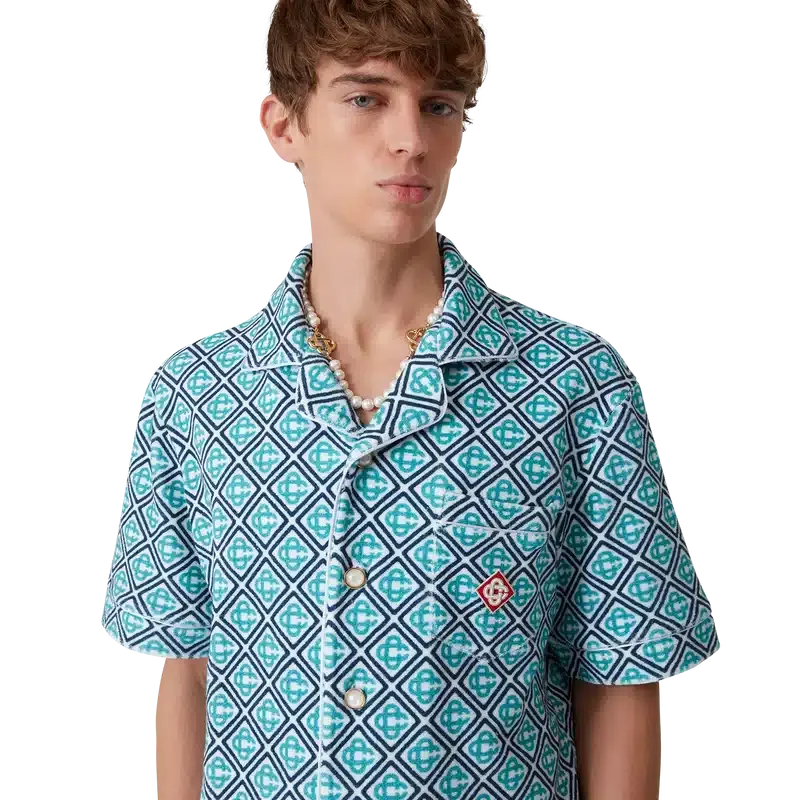 Cămășa din material de prosop cu imprimeu Monogram este un model cu mâneci scurte, confecționat dintr-un material de prosop cu imprimeu Monogram, prezentând un imprimeu Monogram în degrade, care oferă o variantă a imprimeului semnătura Casablanca. Completată cu închidere cu nasturi, nasturi semnătura cu margine aurie și perle, un buzunar la piept și detalii cu bordură pe guler, placket, manșete și buzunar.