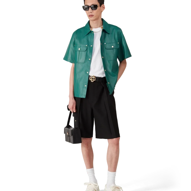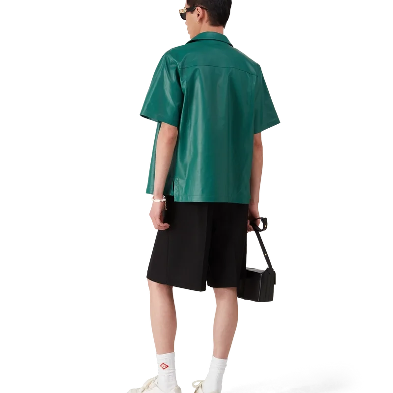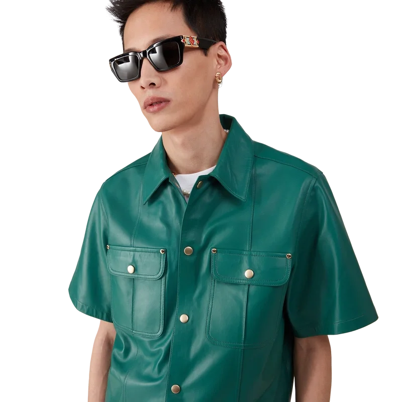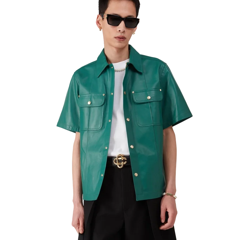Cămașa din piele are mâneci scurte și este confecționată din piele de miel.