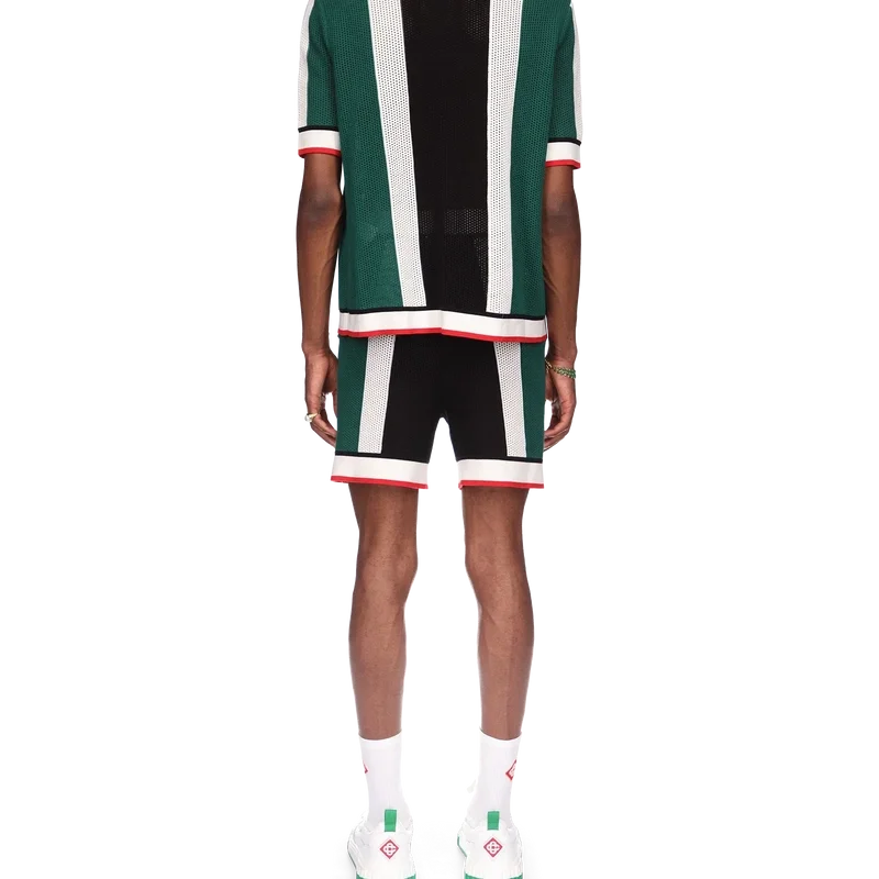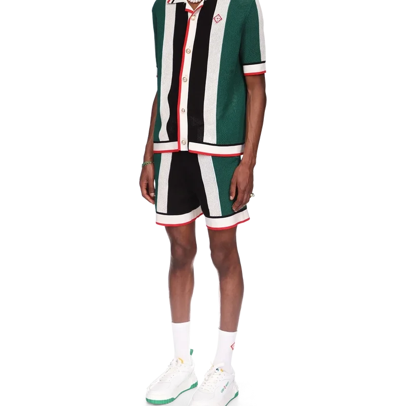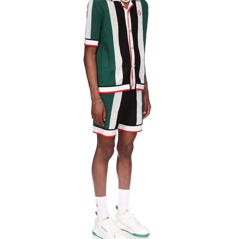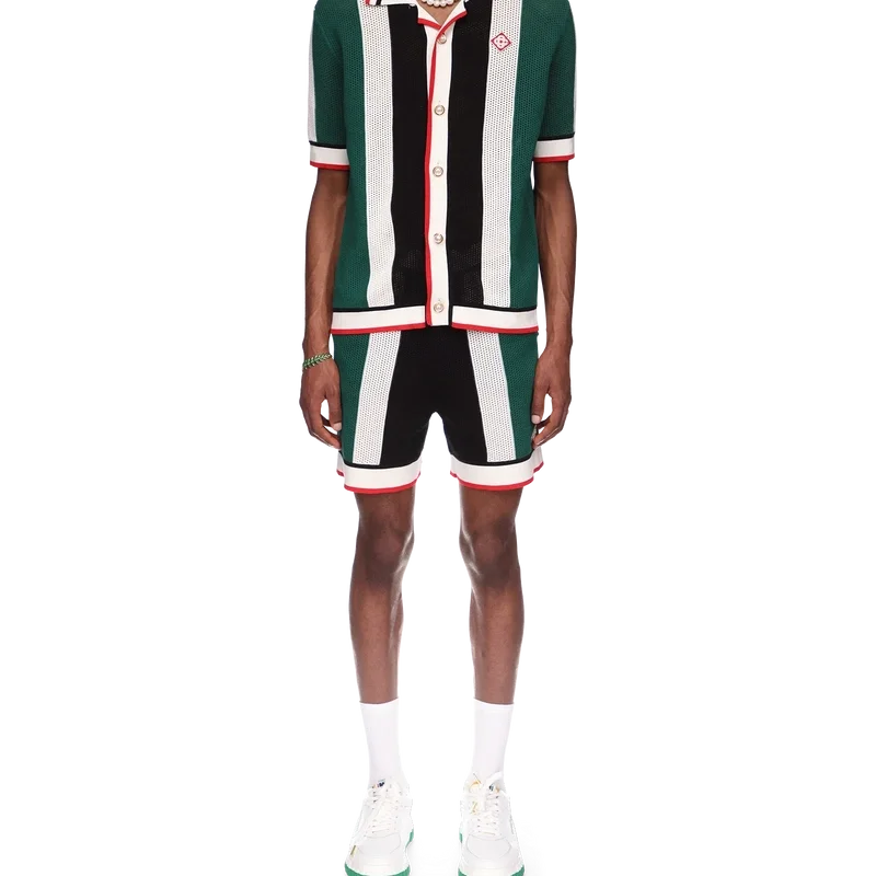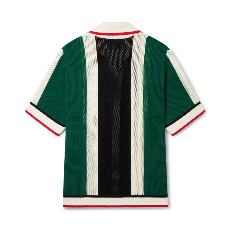 Cămașa din plasă cu dungi este un model cu mâneci scurte inspirat de culorile steagului Nigeriei, confecționată dintr-un material tricotat din bumbac organic, cu patch-ul cu logo-ul în formă de diamant al casei. Completată cu guler, manșete, placket, tiv, închidere cu nasturi și nasturi cu margine aurie și perle, caracteristice mărcii.