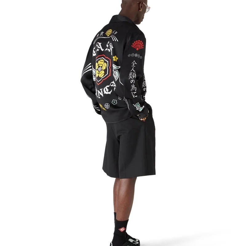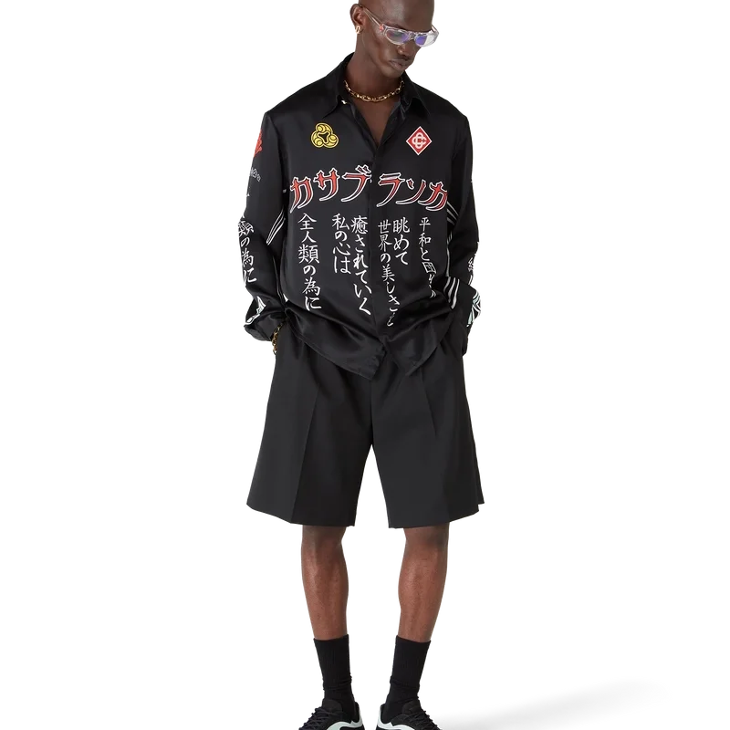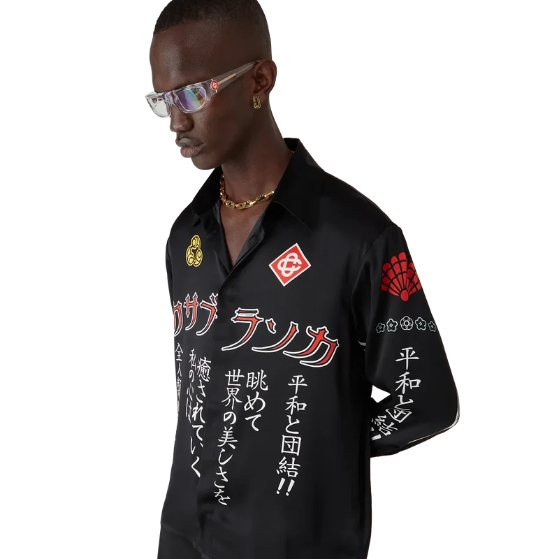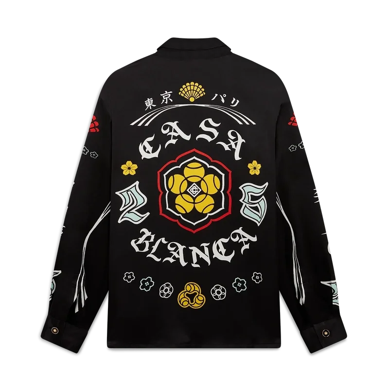 Cămașa din mătase cu mâneci lungi Emblem prezintă un imprimeu cu motivele artistice ale sezonului – ne-am inspirat din subcultura japoneză BōSōZoku pentru una dintre temele noastre principale. Contrastul dintre elementele grafice și text ne-a amintit foarte mult de Casablanca. Am creat propria noastră interpretare, incorporând fraze care descriu brandul, precum „Privind frumusețea lumii”. Dispunerea este neconvențională, dar compoziția este atent echilibrată, conferindu-i un aspect unic, dar armonios. Completată cu guler în V, închidere cu nasturi, nasturi Corozo cu logo Cc intercalat, nasturi emailate cu margine aurie la manșete și la guler.