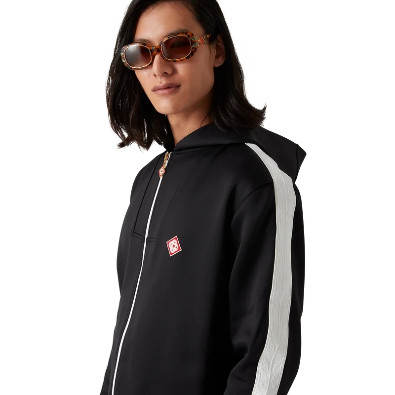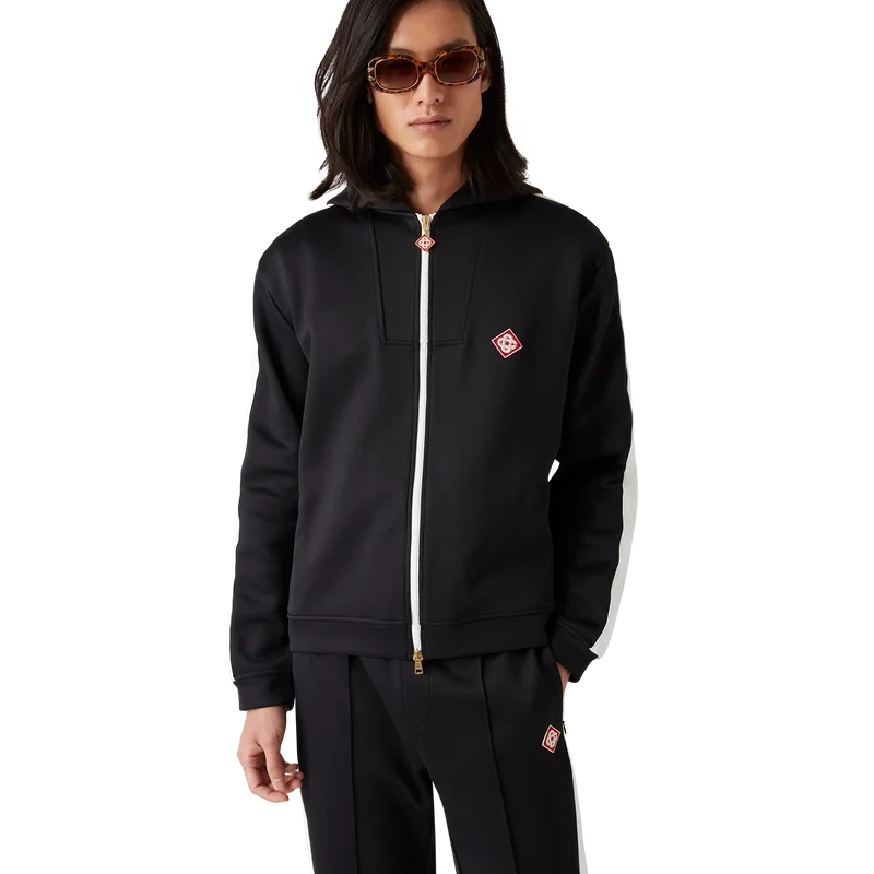 Hanoracul cu glugă Scuba este un articol de îmbrăcăminte sport cu mâneci lungi, confecționat din țesătură jersey Scuba și prezintă detalii cu dungi de la umeri până la mâneci. Este prevăzut cu glugă, închidere cu fermoar în față, manșete și tiv elastic și Diamond Monogram caracteristică.