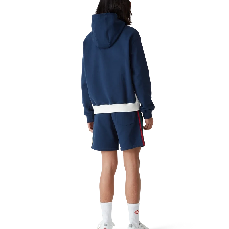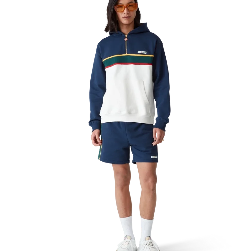 Hanoracul cu glugă și fermoar pe un sfert din blocuri de culoare este un articol sport cu mâneci lungi, confecționat din țesătură de bumbac organic cu buclă. Este prevăzut cu glugă, șnur cu capete aurii pentru o fixare sigură, inserții contrastante, buzunar frontal tip cangur și manșete și tiv cu nervuri.