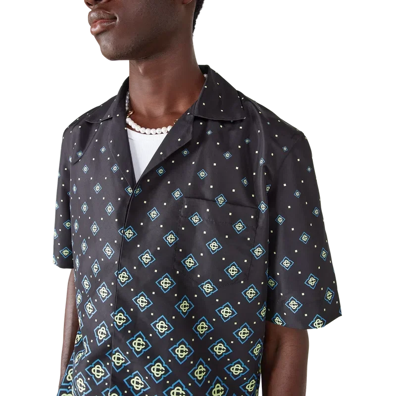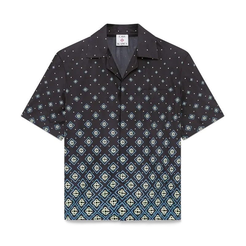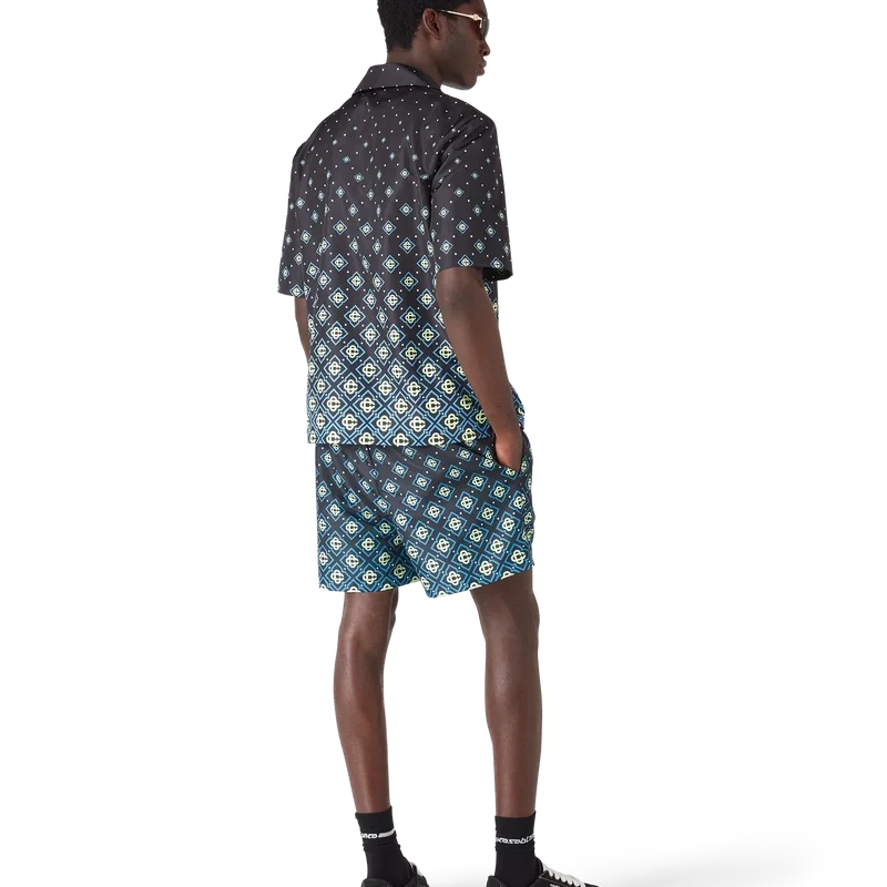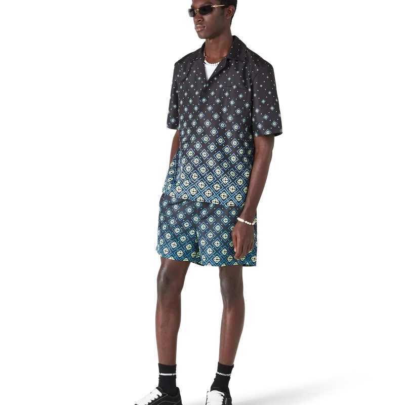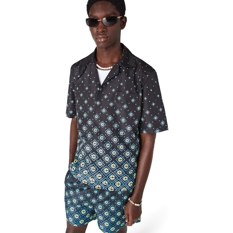 Tricoul de baie cu monogramă negru degradat are un design tehnic rafinat, cu modelul Monogram al casei. Este confecționat din țesătură tehnică pentru înot, are mâneci scurte, închidere cu nasturi, nasturi Corozo cu logo CC intercalat și detalii sofisticate care reflectă abordarea rafinată a mărcii în materie de costume de baie.