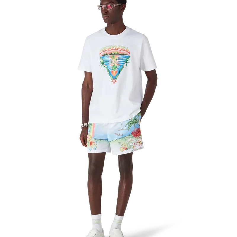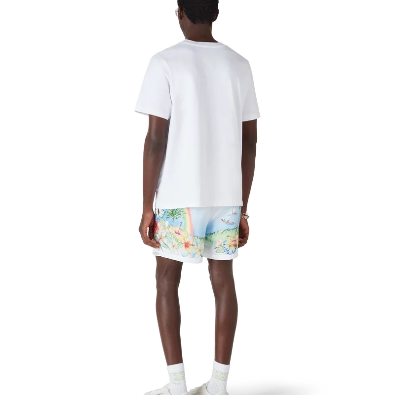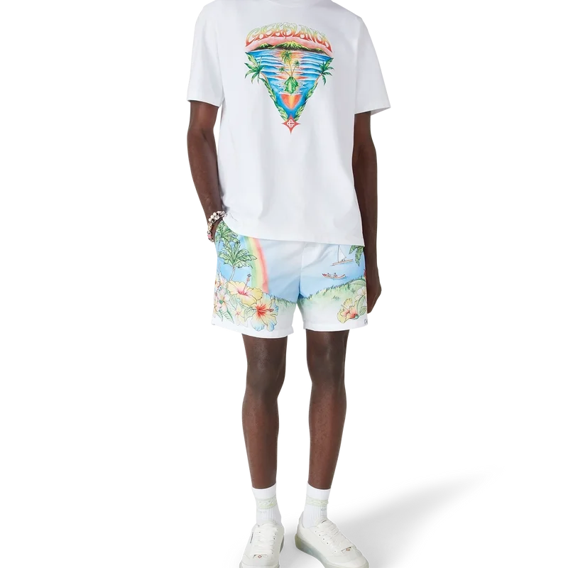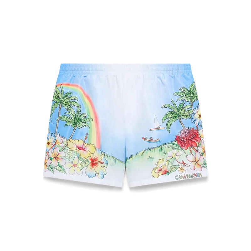Pantalonii scurți de baie cu imprimeu Aloha au un design tehnic rafinat, cu o reprezentare pictată vibrantă a insulei Kauai, Hawaii, prezentând paradisul său montan, cascadele, delfinii jucăuși, canoele și un curcubeu, cu o viziune exagerată asupra frumuseții peisajului. Completat cu o bandă elastică la talie, buzunare laterale și o construcție din țesătură tehnică de înot care surprinde codurile de lux sport-leisure ale mărcii.