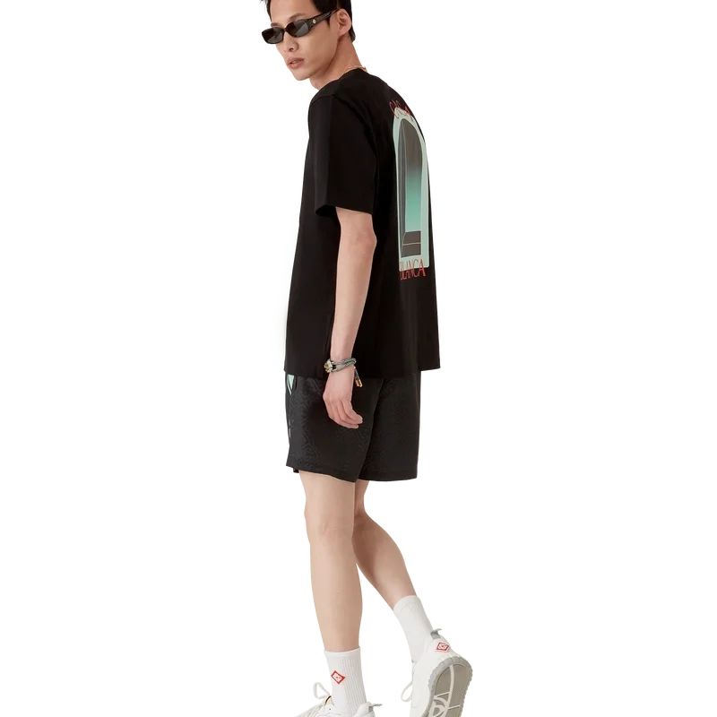 Pantalonii scurți de baie cu dungi Jacquard sunt un model imprimat integral, confecționat dintr-un material de poliester respirabil. Sunt prevăzute cu o bandă elastică în talie, un cordon de strângere interior, buzunare laterale în cusătură, un buzunar interior și o căptușeală.