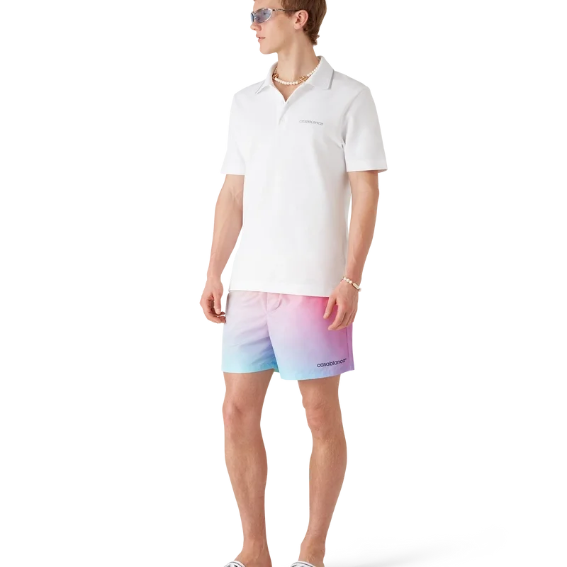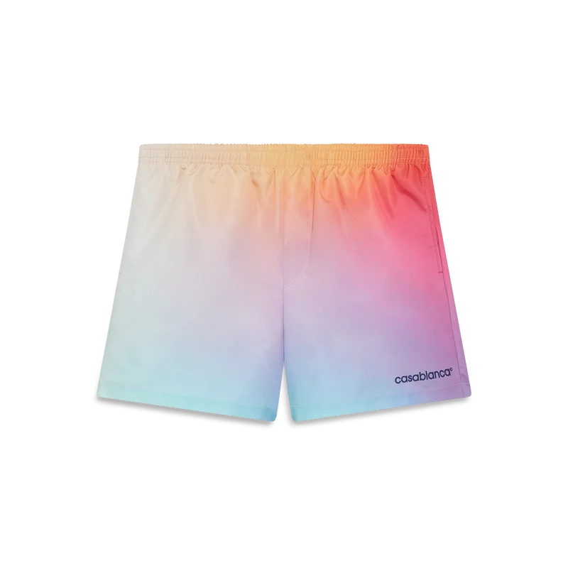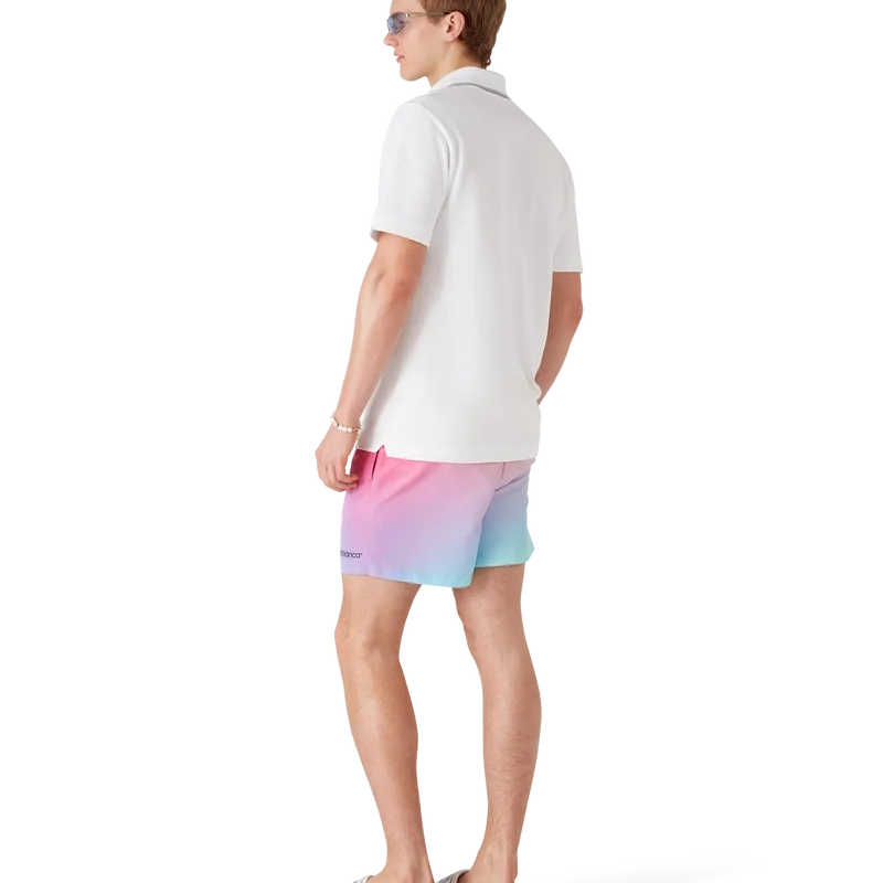 Pantalonii scurți de baie cu imprimeu degradé au un design rafinat, care pune în valoare paleta de culori degradé a sezonului. Sunt prevăzute cu o bandă elastică în talie, sistem de strângere cu șnur interior, buzunare laterale în cusătură, căptușeală, detaliu cu dungi la tiv și logo-ul Warped al casei de modă.