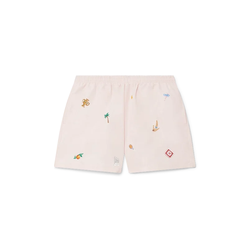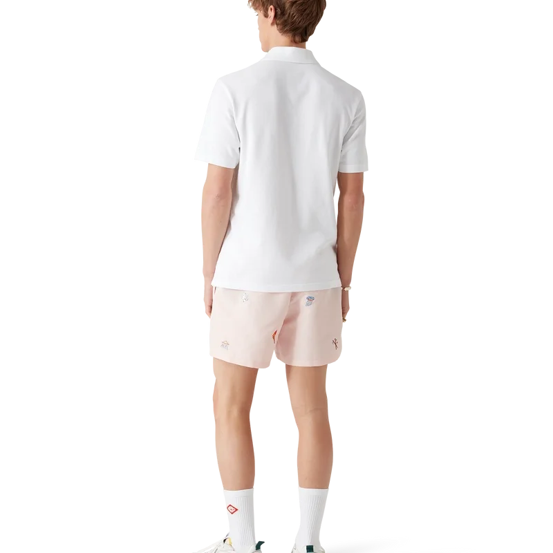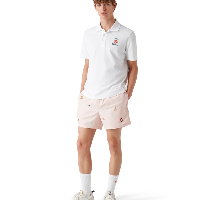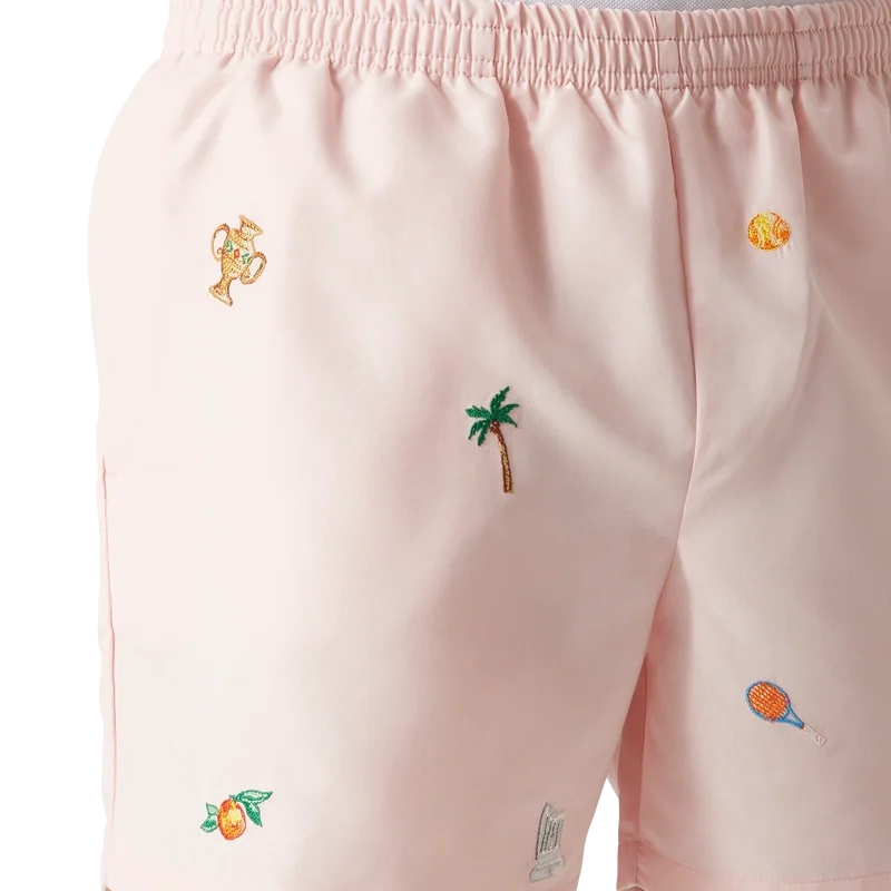 Pantalonii scurți de baie cu motiv brodat au un design clasic, fiind confecționați din țesătură ușoară de poliester, cu motive brodate care reprezintă simbolistica casei de modă, inspirată de natură, tenis și arhitectură. Sunt completate cu o bandă elastică în talie, închidere cu șnur intern, buzunare laterale în cusătură, căptușeală din plasă elastică, un buzunar intern și un logo semnătura sub formă de romb din silicon.