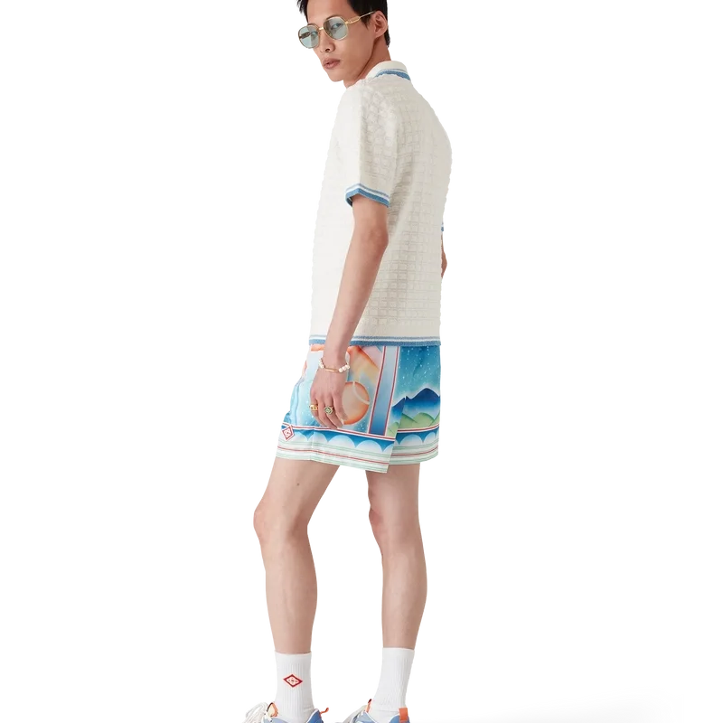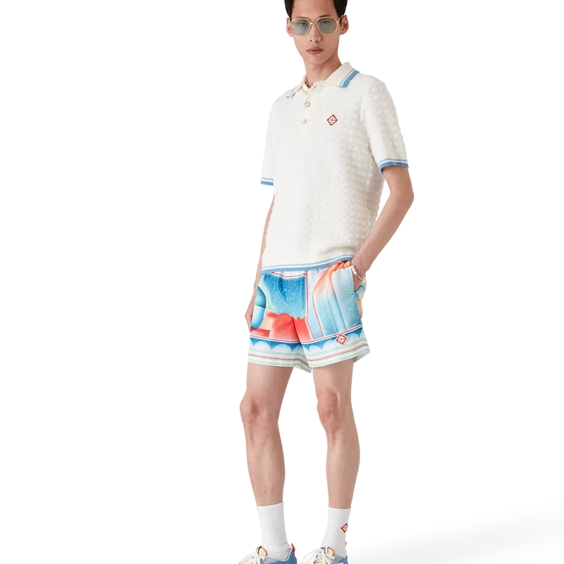 Pantalonii scurți de baie Galaxy Court au un design imprimat pe toată suprafața, cu imprimeul caracteristic al casei, cu una dintre emblemele noastre, folosind din nou layout-ul nostru clasic, dar cu un amestec de elemente de sezon, aducând tema tenisului în colecție, confecționate dintr-un material tehnic pentru înot.