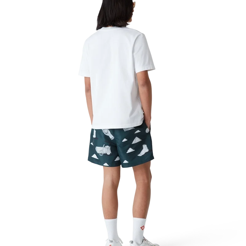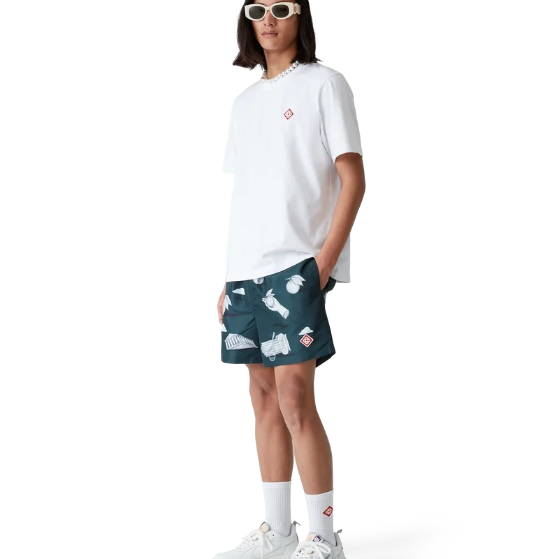 Pantalonii scurți de baie Metaphysical au un design clasic, fiind confecționați dintr-un material tehnic din poliester, cu logo-ul diamant caracteristic casei și un motiv repetitiv Trompe L’oeil cu efect de piatră, cu elemente de design esențiale conturate ușor. Sunt prevăzute cu o bandă elastică în talie, un șnur interior, buzunare laterale în cusătură, căptușeală și un buzunar interior.
