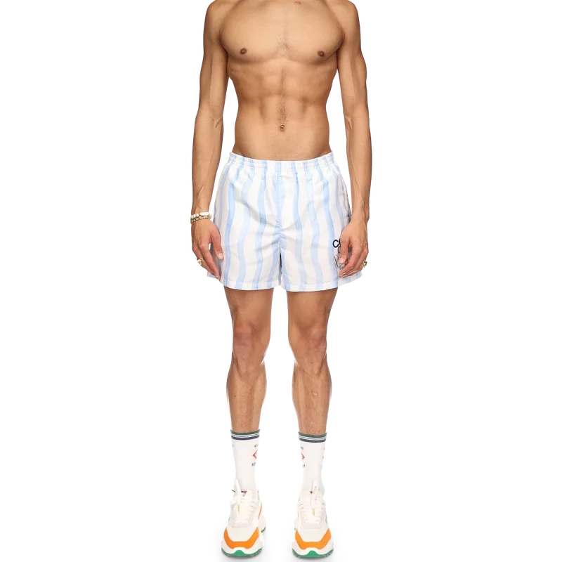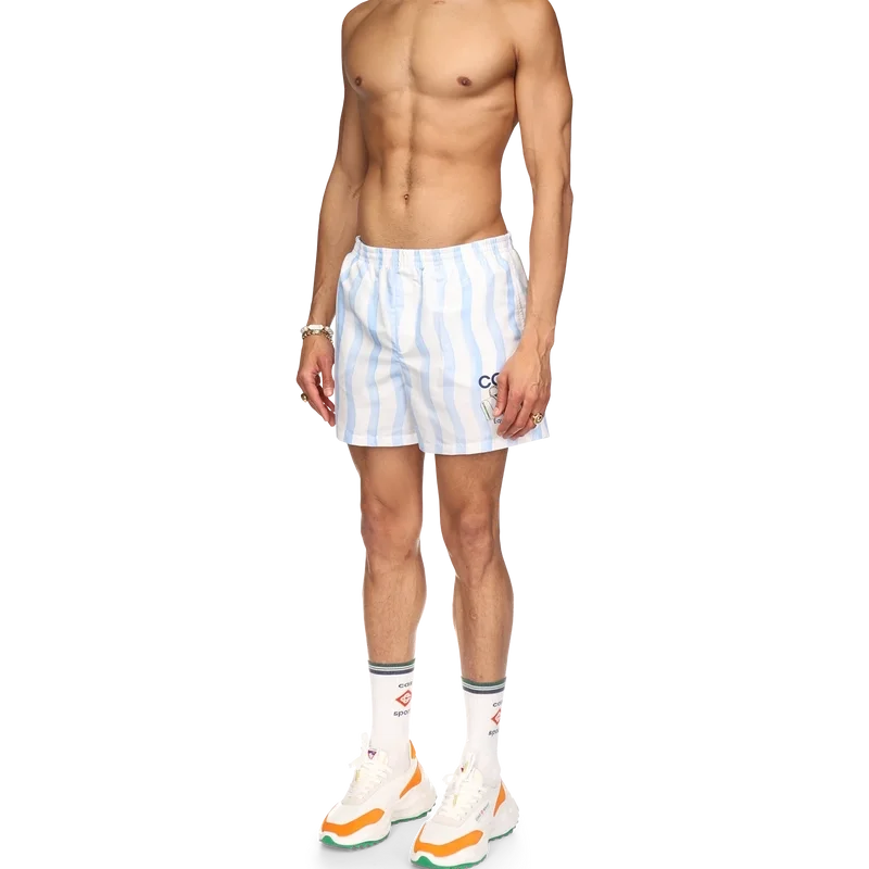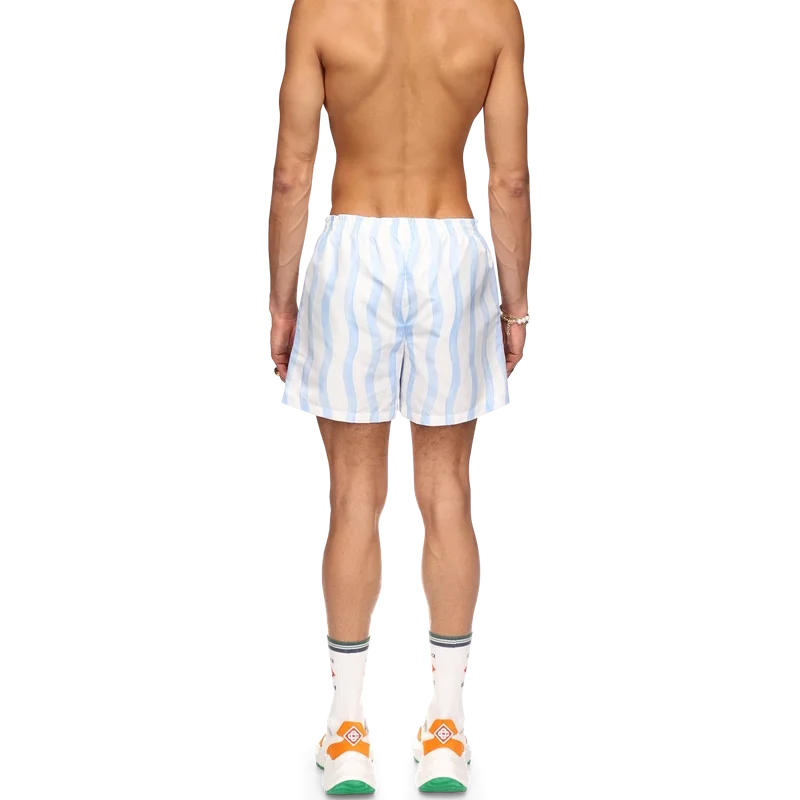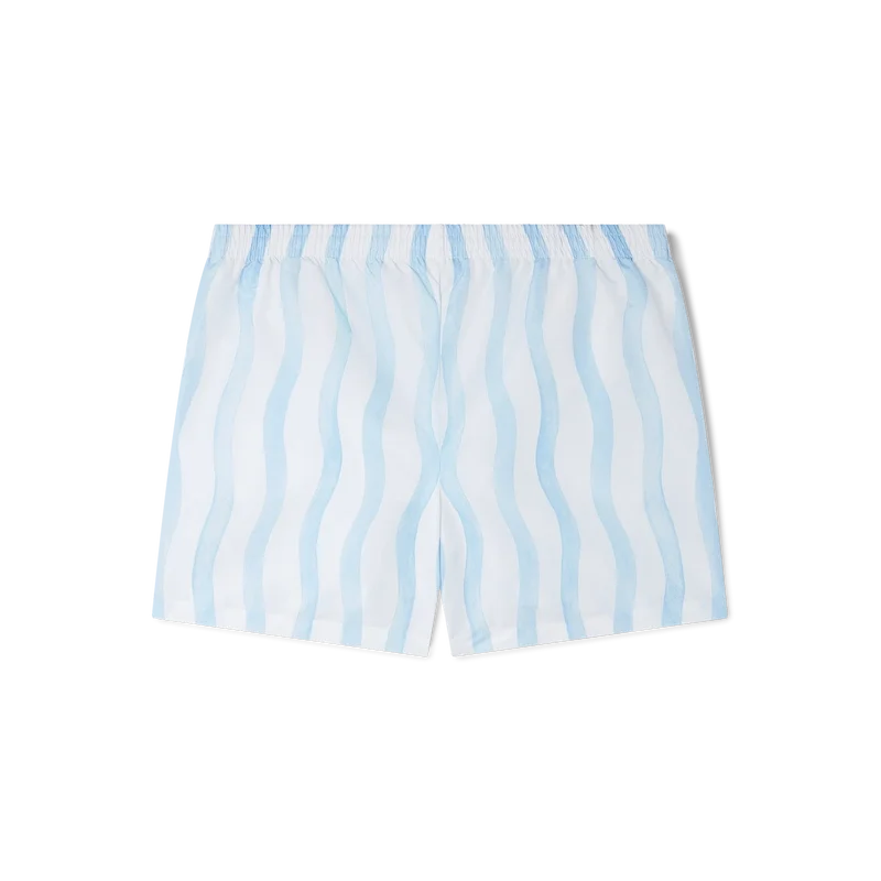 Șortul de baie Wave prezintă designul Memphis Wave al casei, fiind confecționat dintr-un material din poliester, cu talie elastică, buzunare laterale și căptușeală. Este completat cu o etichetă cu marca Casablanca și cu grafica sezonieră a casei.