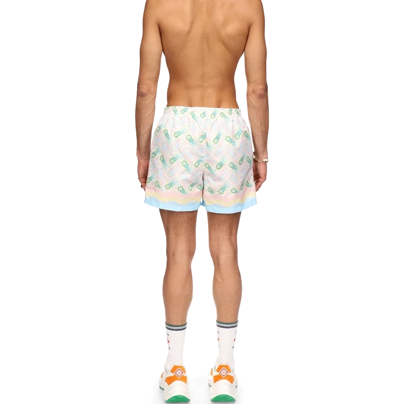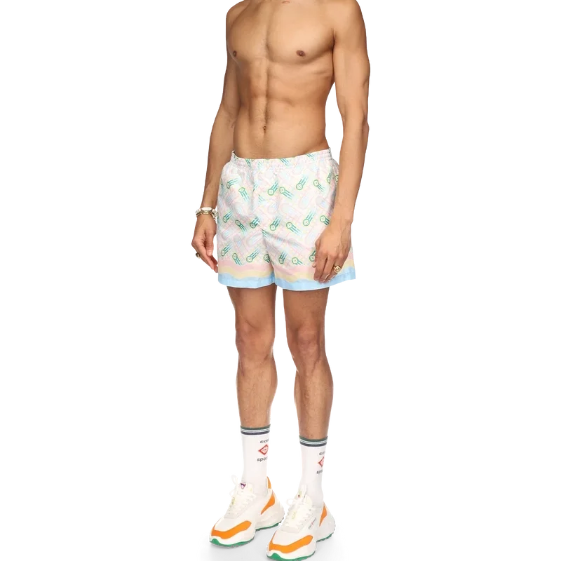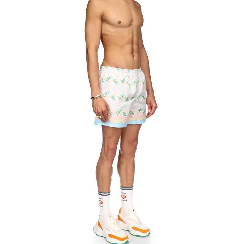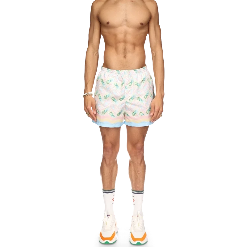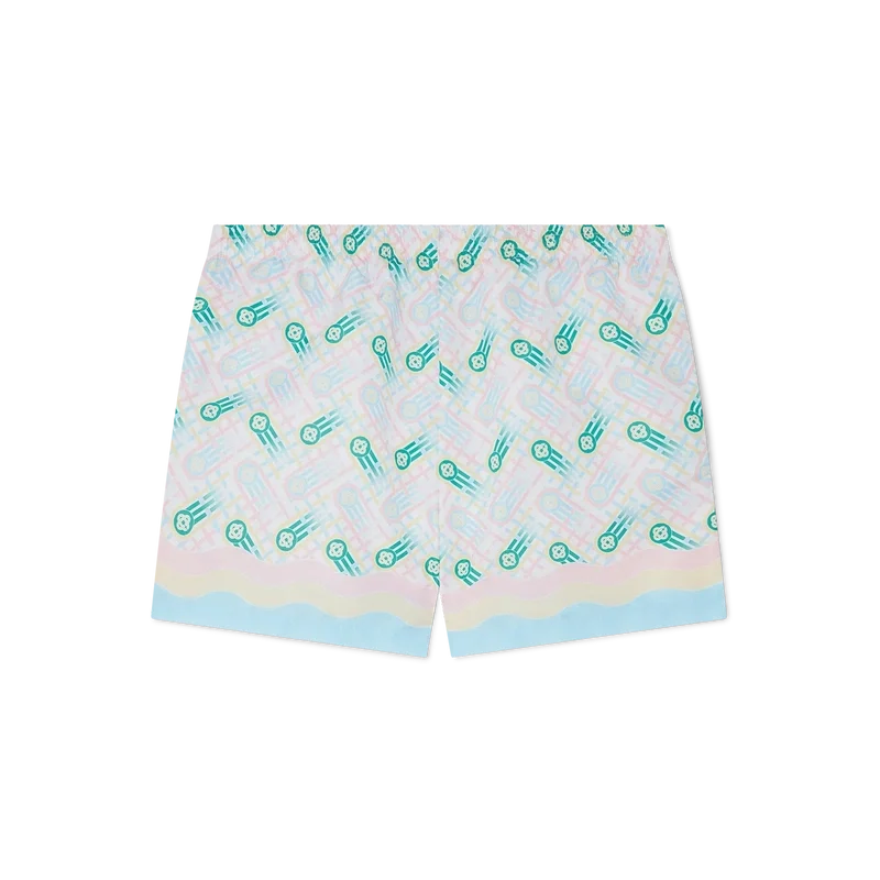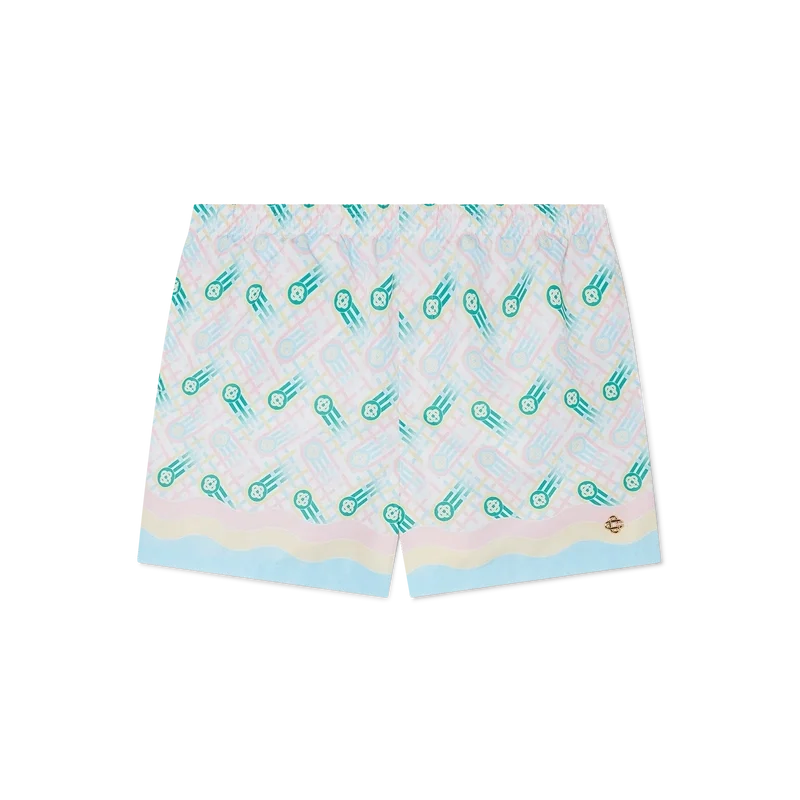 Slipul de baie Ping Pong are un design imprimat inspirat de colecția anterioară a casei de modă dedicată Japoniei, prezentând o minge de ping-pong în mișcare și detalii la tiv inspirate de valurile din Memphis. Confecționat din țesătură de poliester, cu bandă elastică în talie, buzunare laterale și căptușeală, acest articol este completat de o etichetă cu marca Casablanca.