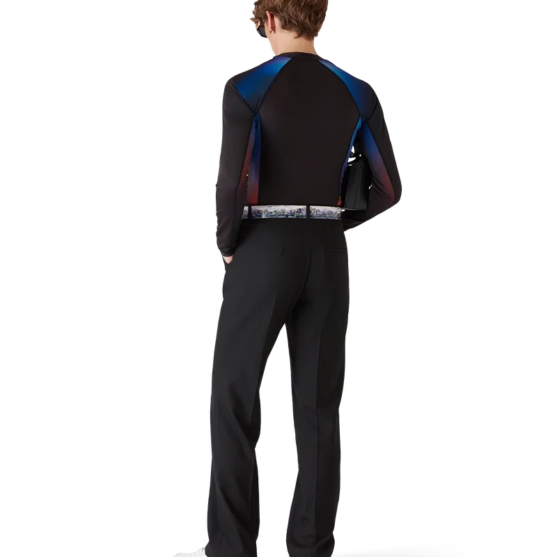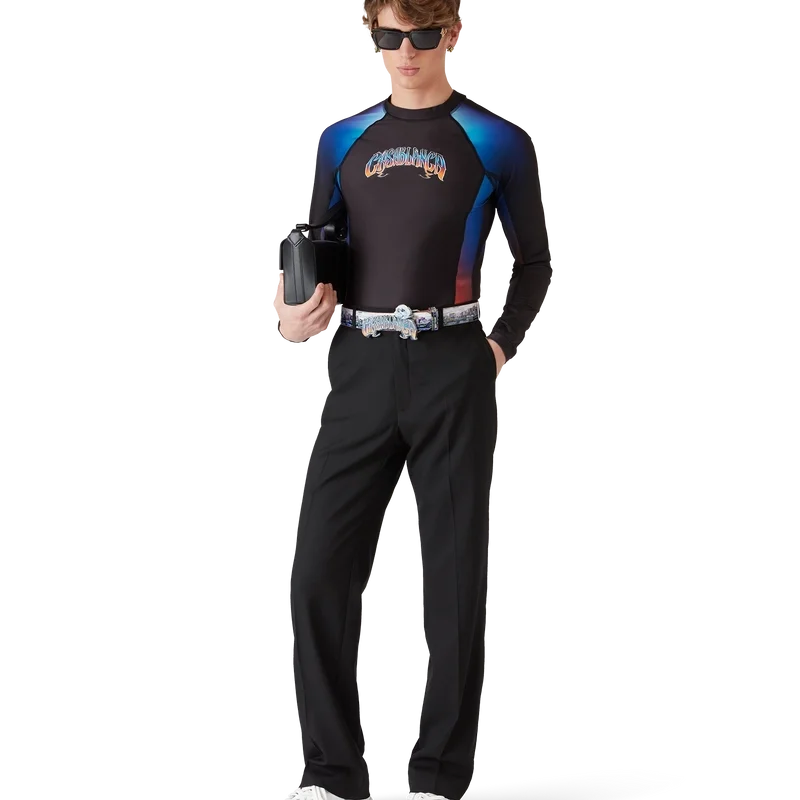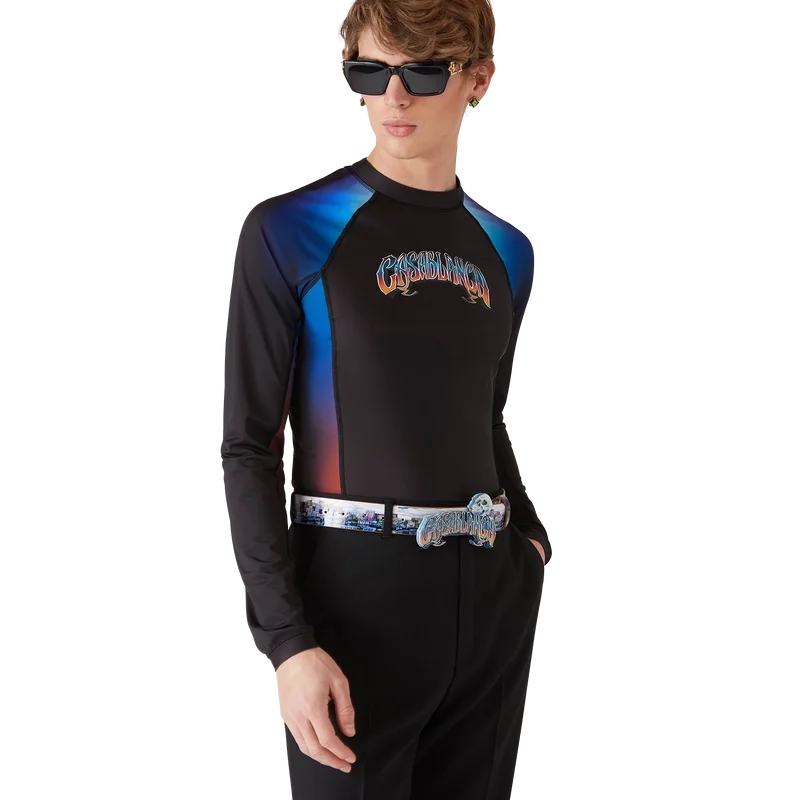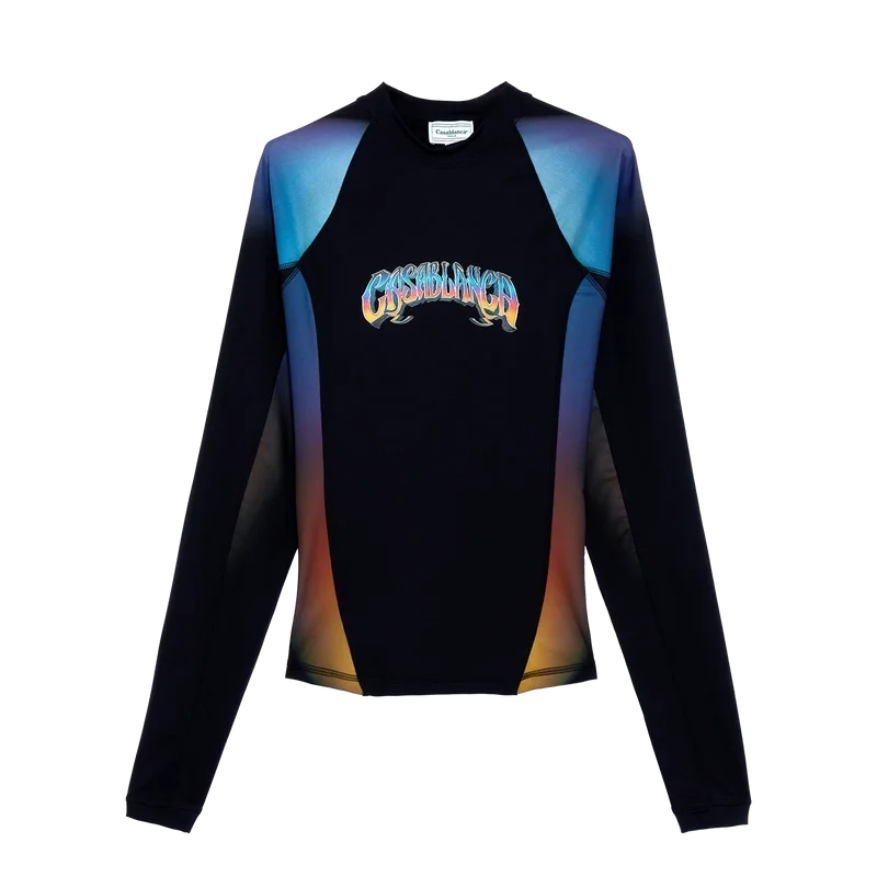 Vesta Gradient Rash este un model imprimat, cu mâneci lungi și croială ajustată, care prezintă culorile gradient ale sezonului și este confecționată din țesătură de înot. Finisată cu o tipografie desenată manual a logo-ului Casablanca, inspirată de fontul gotic folosit în tatuaje, guler înalt și panouri laterale și pe mâneci cu efect gradient.