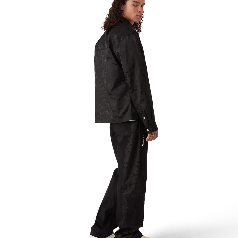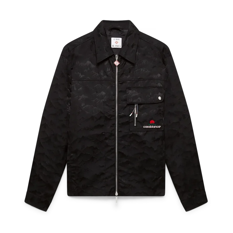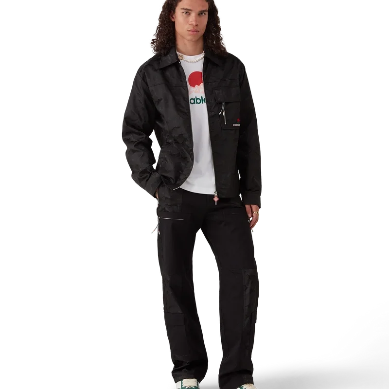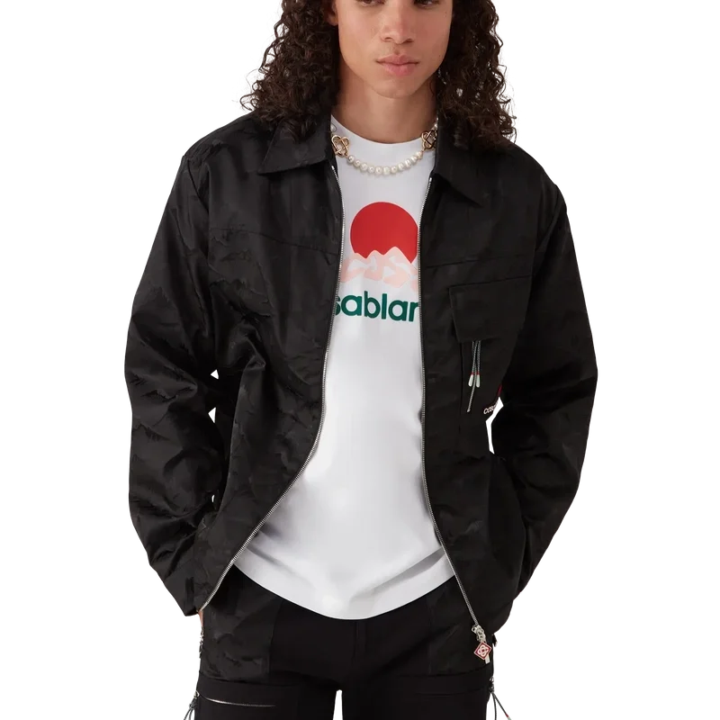 Cămașa din nailon cu imprimeu camuflaj și fermoar este un model cu mâneci lungi, confecționat din țesătură Jacquard, cu logo-ul diamant caracteristic al casei. Completată cu guler în V, închidere cu fermoar cu etichetă cu logo-ul diamant al casei, buzunar cu clapă pe piept cu fermoar vertical și șnururi inspirate de cablurile de alpinism din acest sezon, accesorii metalice cu logo pe manșete și buzunar, precum și logo-ul Casa Montagne al casei – un logo care la prima vedere arată ca un munte, dar care, dacă te uiți mai atent, se citește Casa.