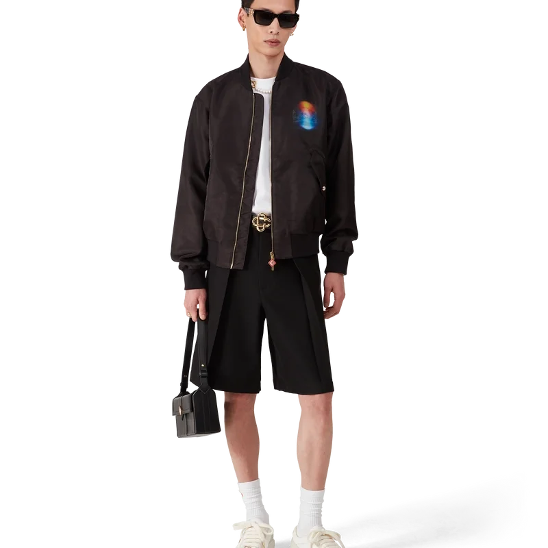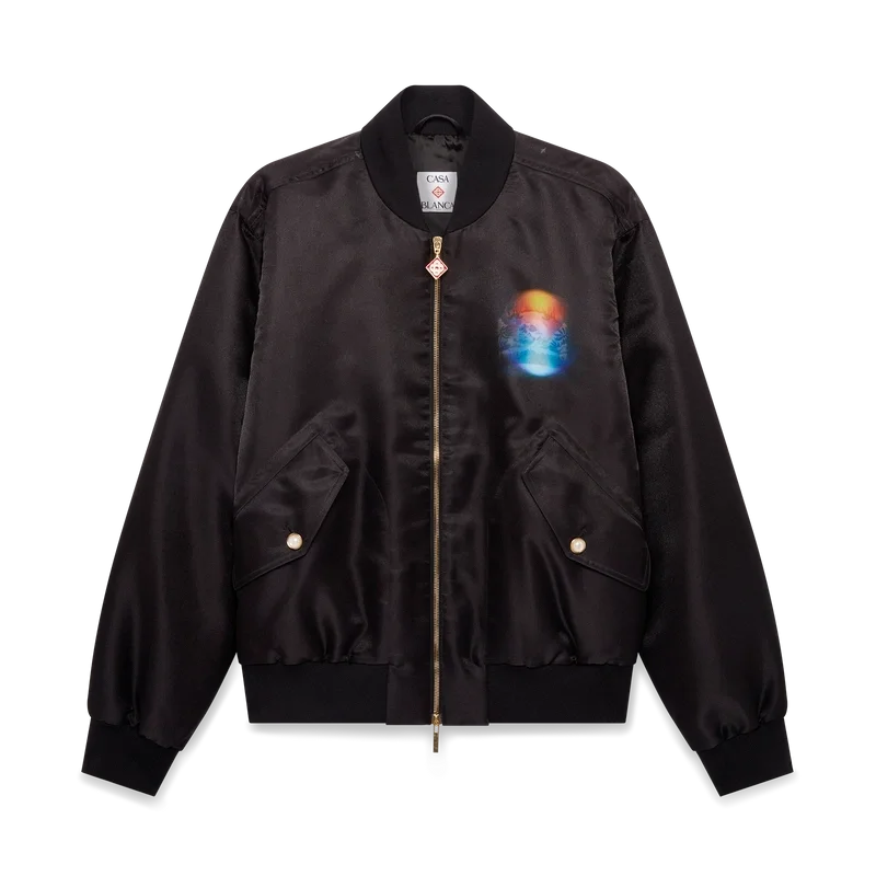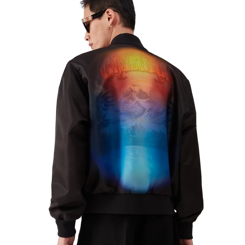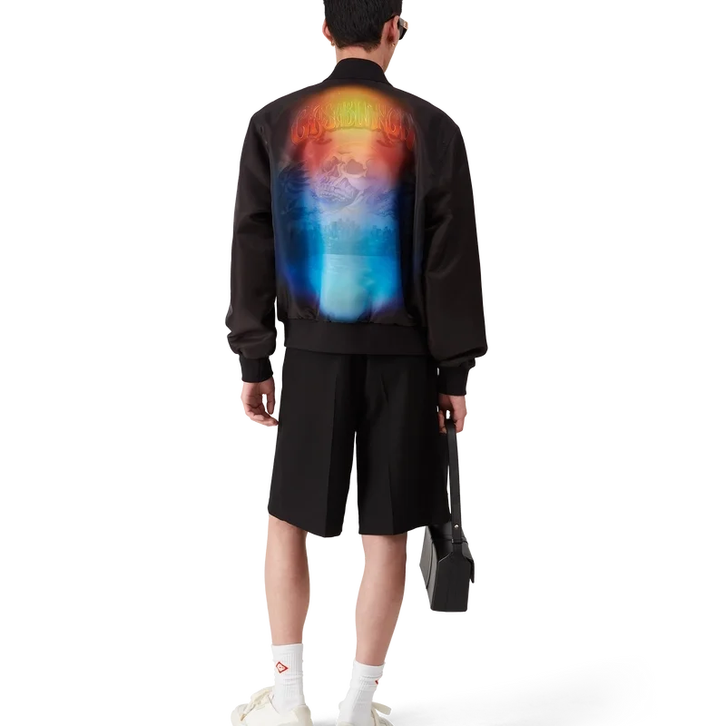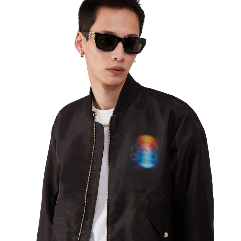 Jacheta bomber din organza cu gradient este o siluetă clasică confecționată din țesătură de organza, prezentând gradientul sezonului și opera de artă La Pramonition, o viziune misterioasă a orizontului orașului La noaptea, cu elemente OZN care fac referire la inspirația sci-fi vintage – pe piept și pe spate. Completată cu închidere cu fermoar, buzunare frontale cu clapă și închidere cu nasturi cu margine aurie și perle, precum și guler, manșete și tiv din tricot cu nervuri.
