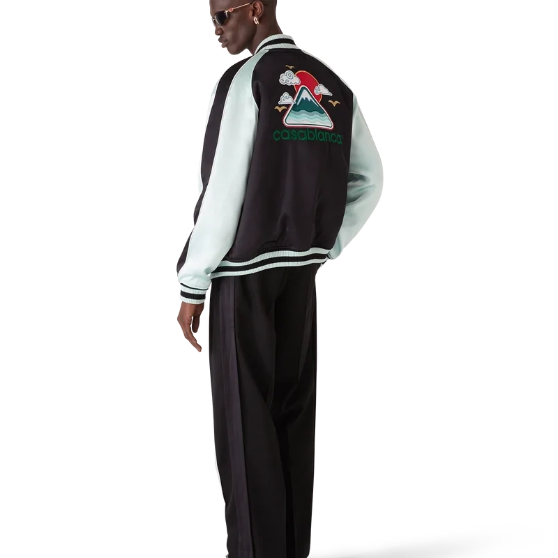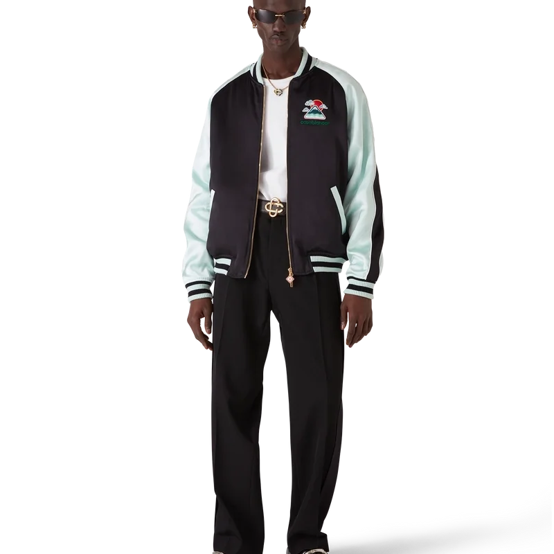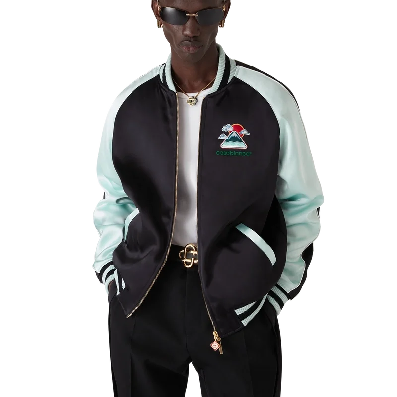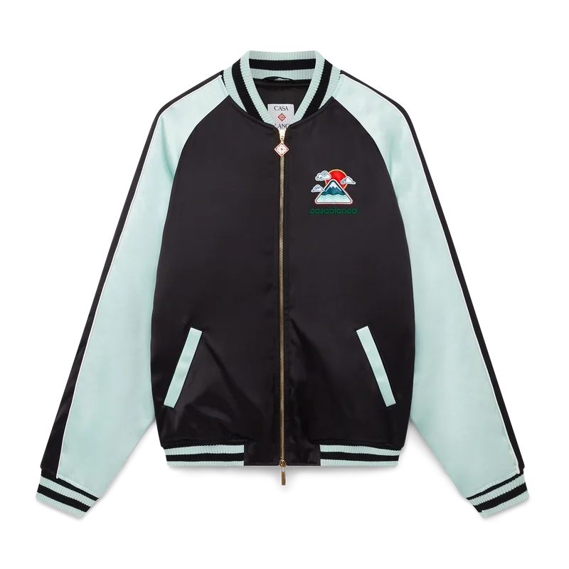 Jacheta bomber din satin brodat este o jachetă tradițională în stil bomber, confecționată din țesătură de satin, cu motive inspirate din bogata iconografie japoneză, care transmite un mesaj vizual puternic cu doar câteva linii și culori, făcând-o una dintre emblemele colecției.