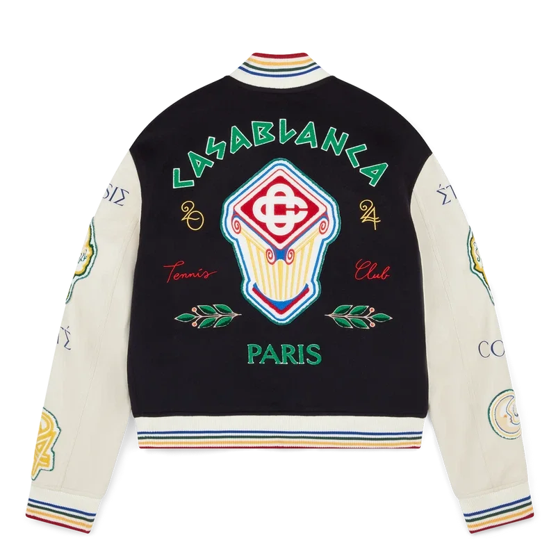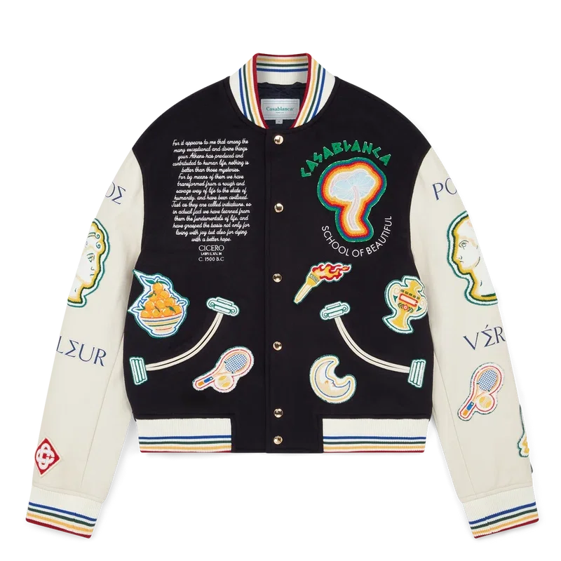 Jacheta bomber din patchwork de chenilă este o jachetă tradițională în stil bomber, cu elemente iconografice utilizate în colecțiile anterioare, confecționată din lână virgină și piele, cu broderii cu litere grecești care reflectă influența Greciei Antice, împletite cu elemente futuriste și elemente de design caracteristice casei, precum frunza de laur, o rachetă și o minge de tenis, portocale și o torță. Completată cu motive sezoniere din Grecia Antică, deschideri de buzunare create de o coloană ionică curbată, închidere cu nasturi cu accesorii metalice placate cu aur, guler ridicat din tricot, manșete și tiv cu detalii din dungi multicolore.