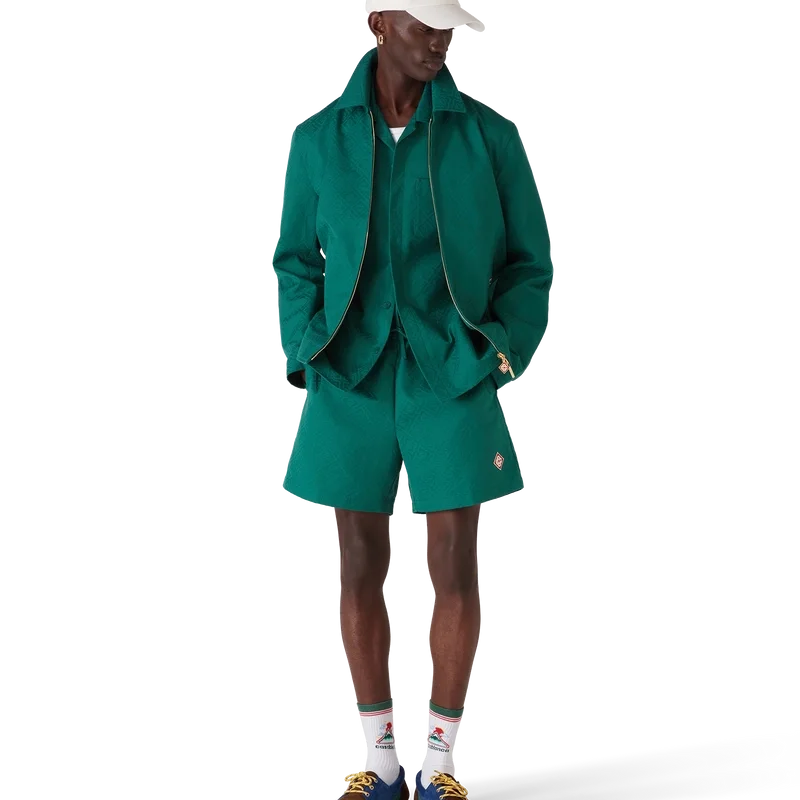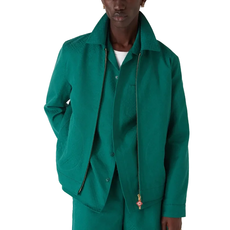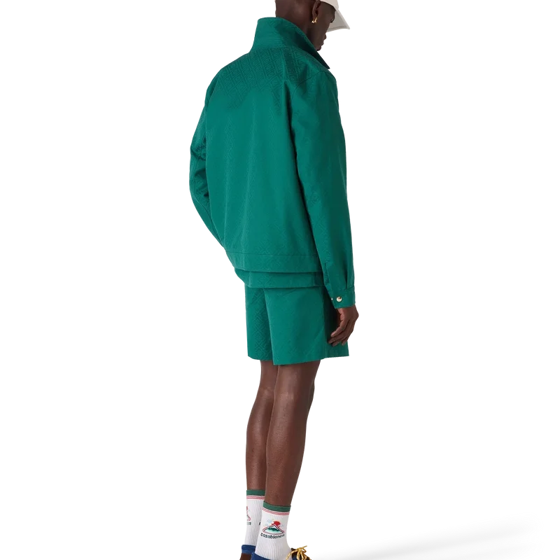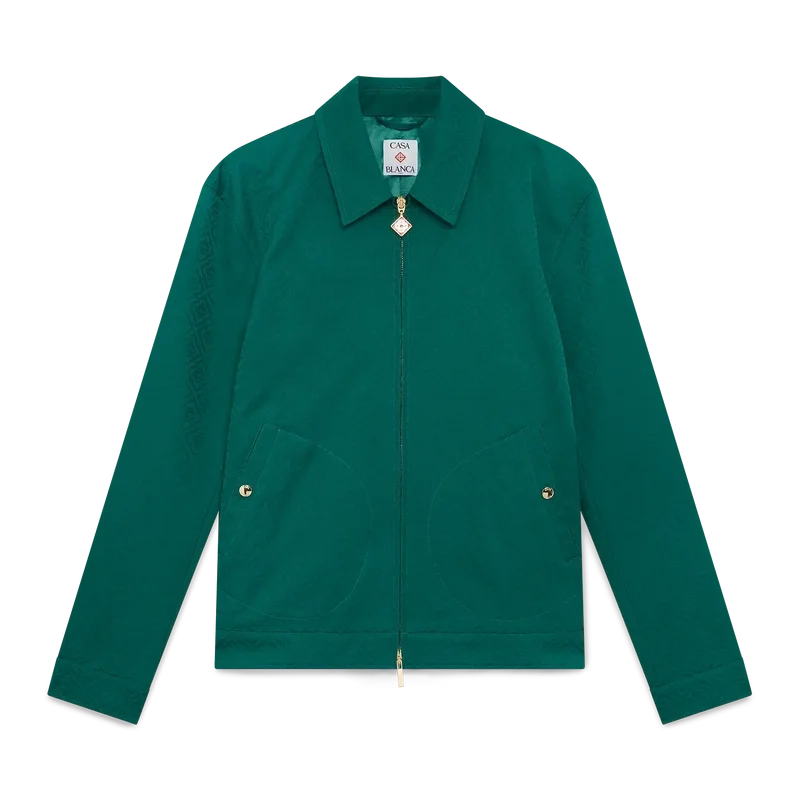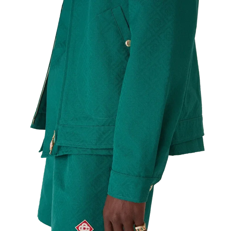 Jacheta din bumbac jacquard cu monogramă este un model de bluzon cu mâneci lungi, confecționat din țesătură de bumbac jacquard. Prezintă închidere cu fermoar, guler în formă de pâlnie, accesorii placate cu aur și buzunare cu clapă înclinate.