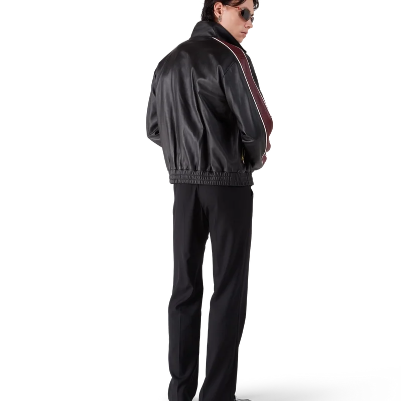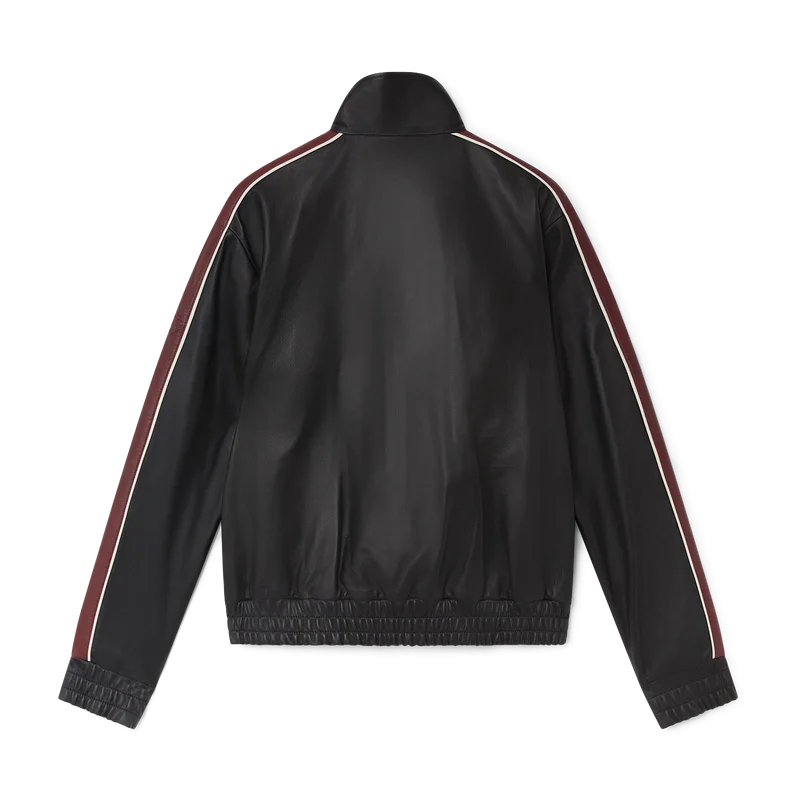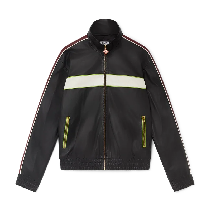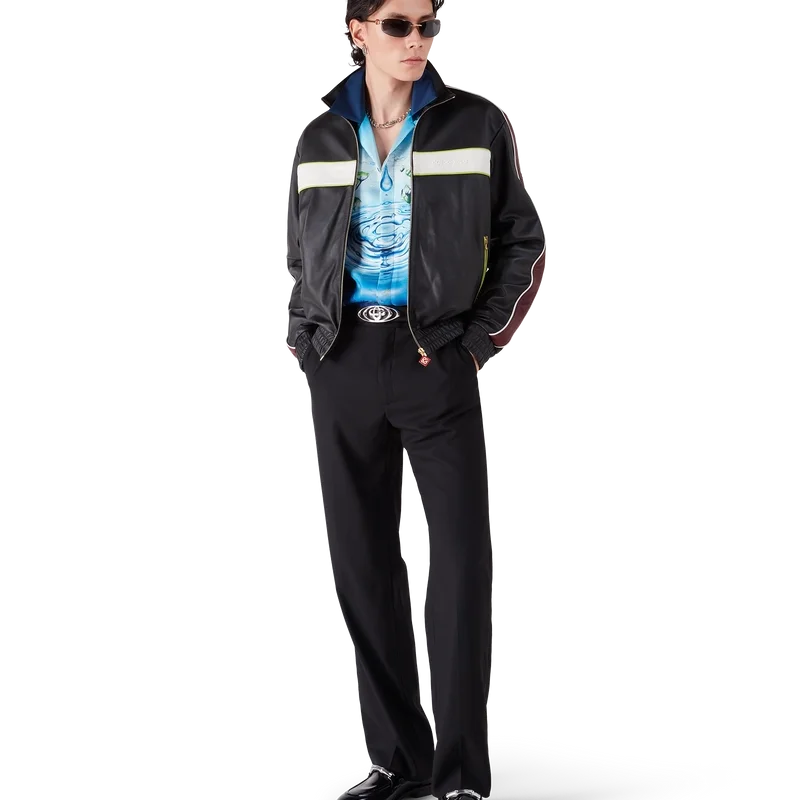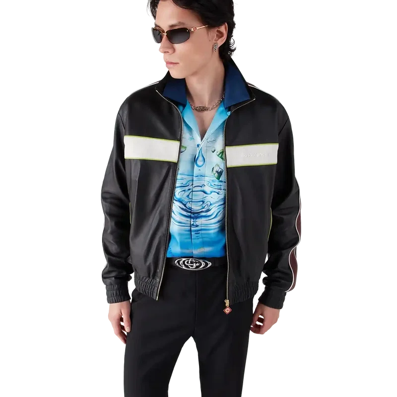 Jacheta din piele neagră are un design rafinat, fiind confecționată din piele de miel nappa suplă, cu logo-ul Casablanca al casei de modă pe piept. Completată cu guler înalt, închidere cu fermoar cu logo-ul diamant caracteristic casei, căptușeală, logo-ul Cc interconectat al casei embosat pe mânecă, buzunare verticale cu bordură contrastantă și închidere cu fermoar, detalii cu dungi și borduri contrastante pe umeri, pe mâneci și pe piept, precum și manșete și tiv elasticizate.