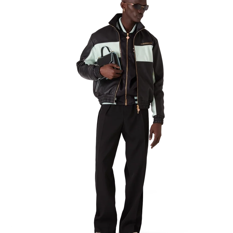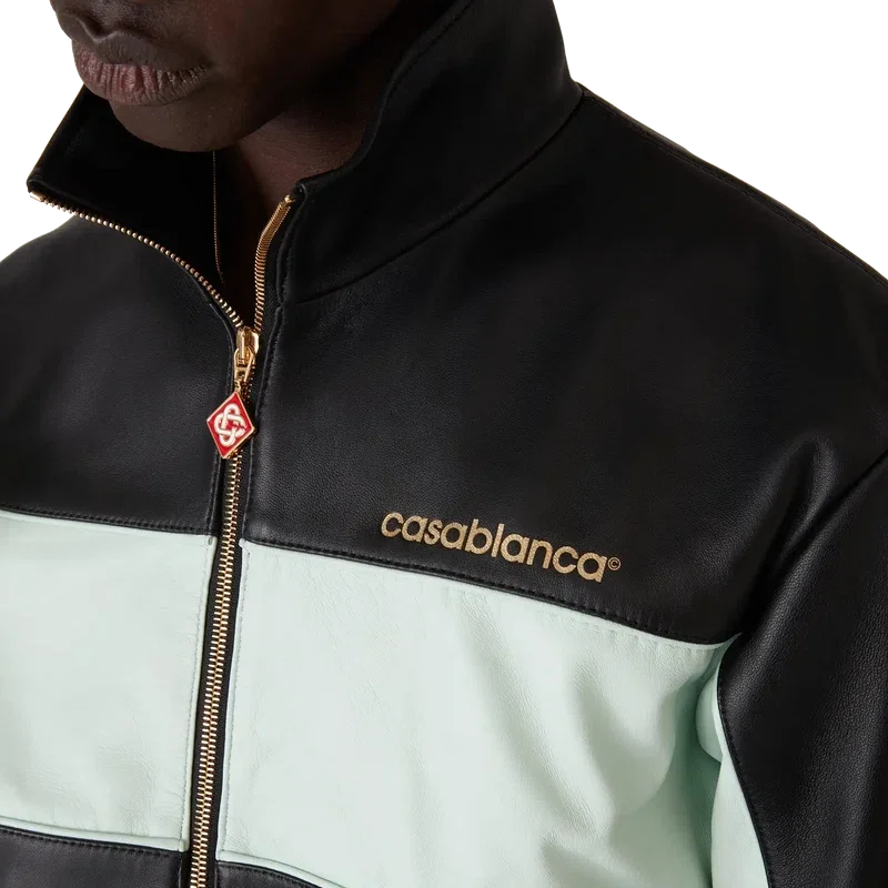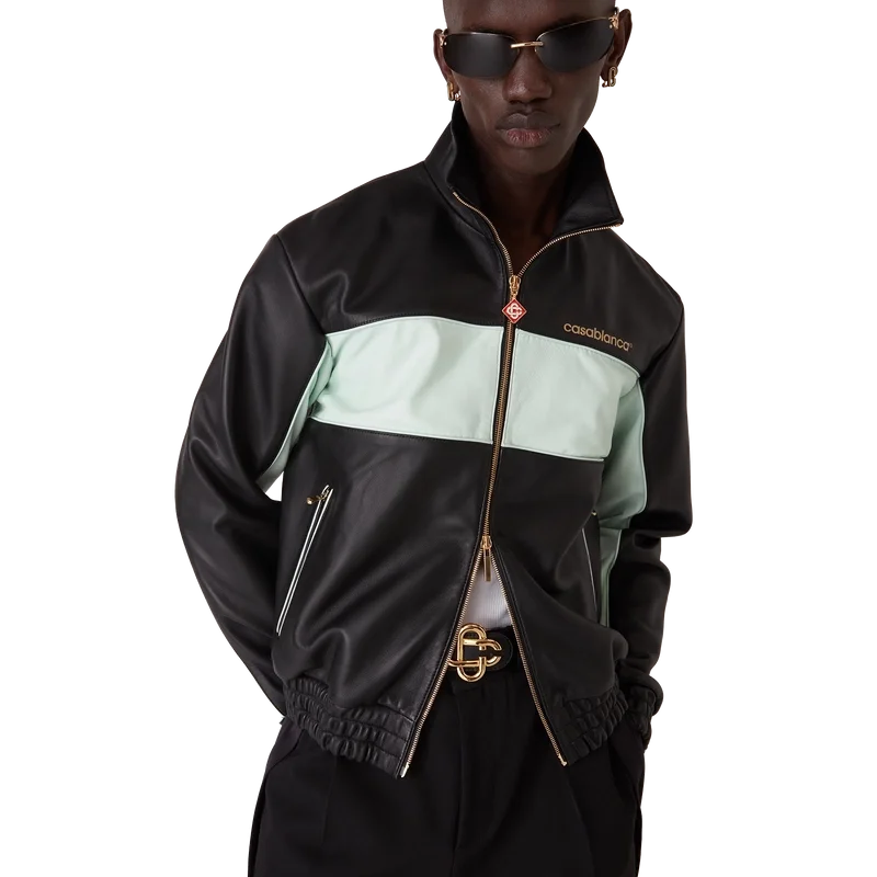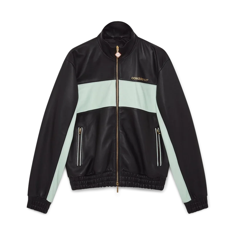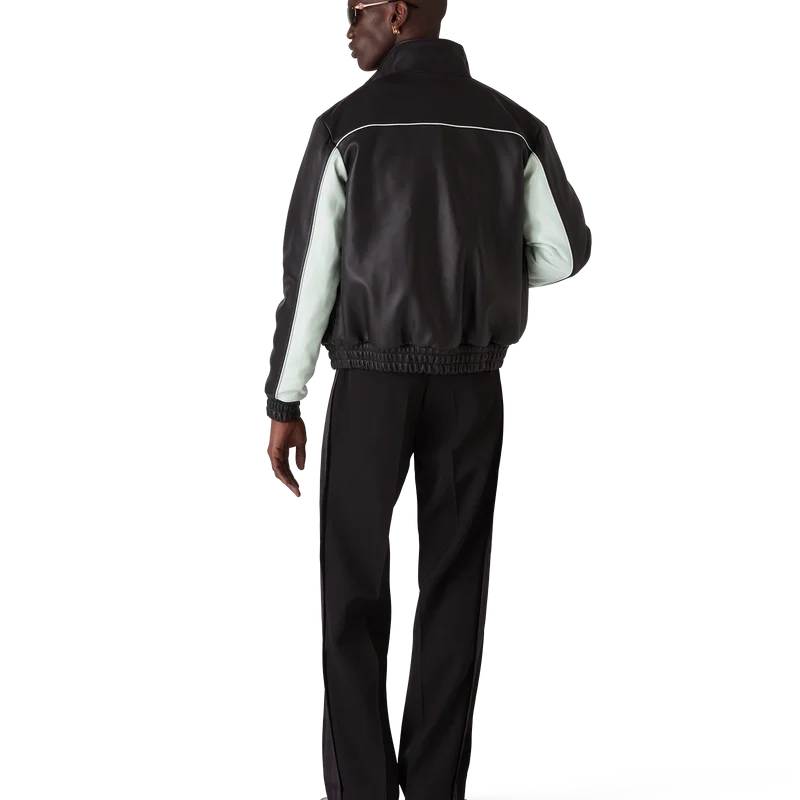 Jacheta sport din piele este un model cu mâneci lungi, confecționat din piele de miel Nappa. Prezintă căptușeală, guler în formă de pâlnie, închidere cu fermoar cu logo-ul în formă de diamant al casei de modă, buzunare înclinate cu bordură și manșete și tiv elasticizate.