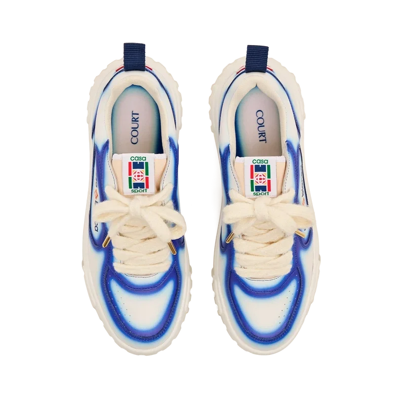 Limbajul de design al adidașilor Court reflectă siluetele iconice ale anilor ’90. Culorile prezente pe toată talpa de cauciuc sunt o combinație între codurile rafinate ale tenisului și arhitectura clasică și creează o paletă unitară pe toată suprafața pantofului, cu accent pe culorile primare, contrastate de albul specific tenisului, pentru a crea o poveste cromatică cu accent sportiv. Partea superioară a încălțămintei prezintă linii integrate și fluide ale panourilor, ca un omagiu adus siluetelor iconice ale anilor ’90. Brandul Casablanca este evident pe toată suprafața, incluzând motivul diamantului caracteristic mărcii pe călcâi, panourile laterale cu sigla din silicon și eticheta țesută cu motivul terenului de tenis de pe limbă și talpă interioară, dând naștere numelui său, Court.
