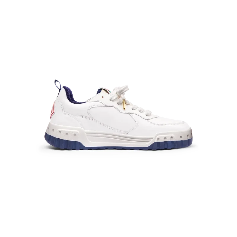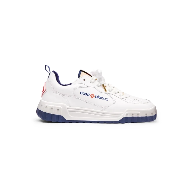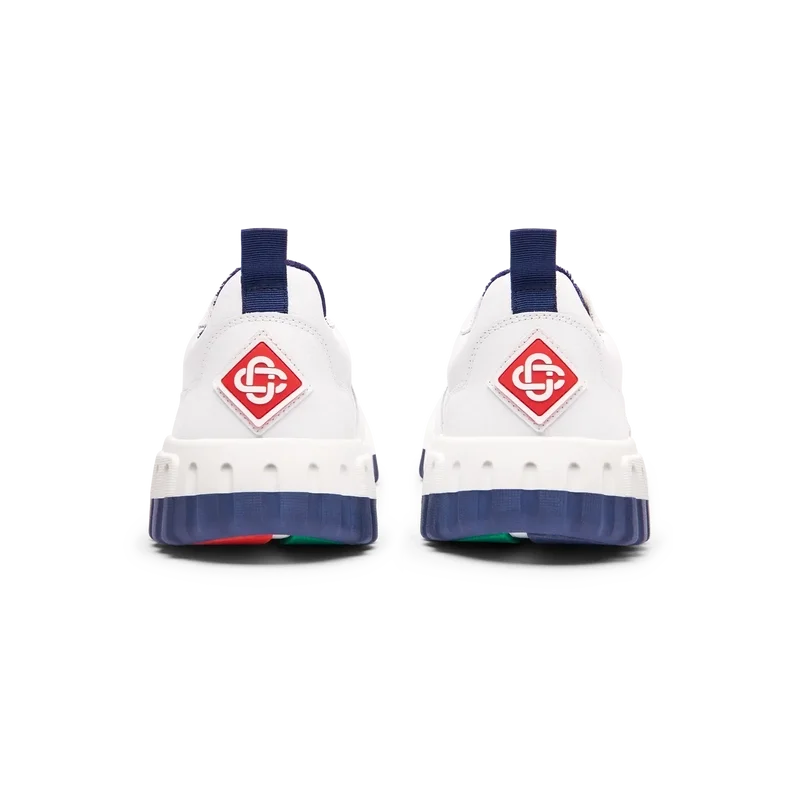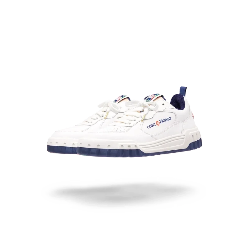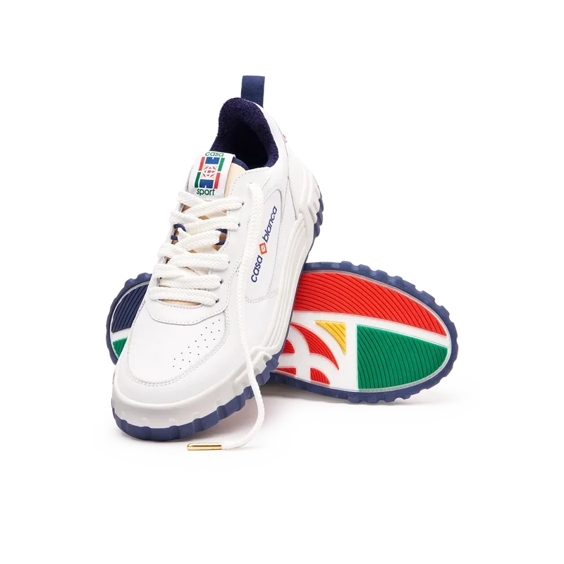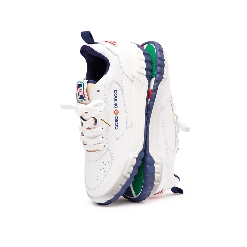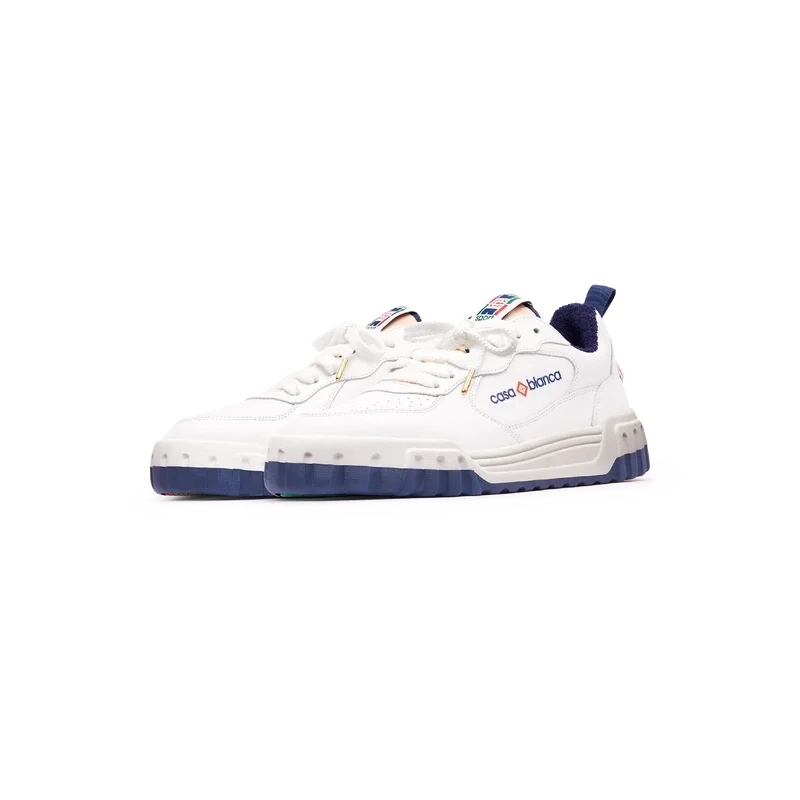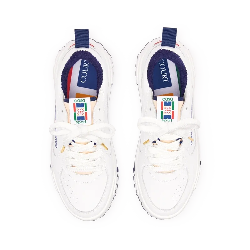 Partea superioară a încălțămintei prezintă linii integrate și fluide ale panourilor, ca un omagiu adus siluetelor iconice ale anilor ’90. Brandul Casablanca este evident peste tot, incluzând motivul diamantului caracteristic mărcii pe călcâi, panourile laterale cu sigla din silicon și eticheta țesută cu motivul terenului de tenis de pe limbă și talpă interioară, dând naștere numelui său, Court.