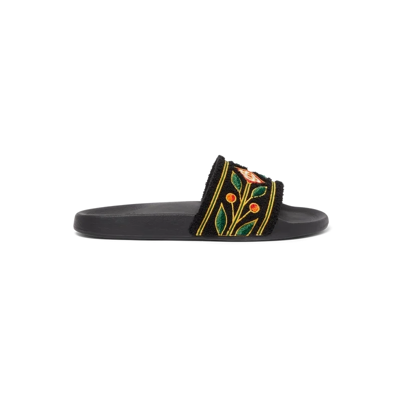 Papucii de bărbați Laurel Terry sunt confecționați din țesătură Terry și prezintă logo-ul în formă de diamant al casei de modă și motivul distinctiv Laurel pe partea superioară. Sunt prevăzuți cu o talpă sculptată pentru un confort sporit și o talpă texturată cauciucată care îmbină performanța cu stilul casual.