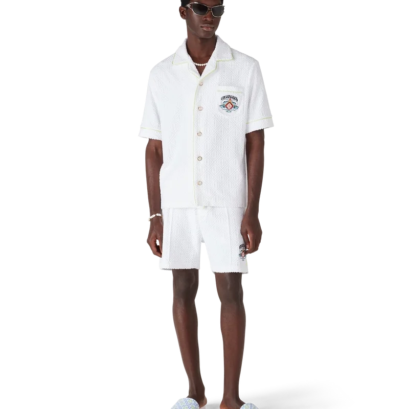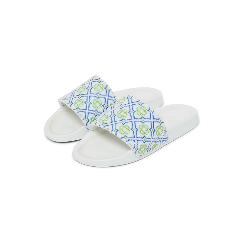 Papucii de piscină Monogram pentru bărbați au un design rafinat, fiind confecționați din țesătură de prosop Monogram și prezintă Diamond Monogram-ul casei pe partea superioară. Sunt completați cu tălpi din cauciuc căptușite.