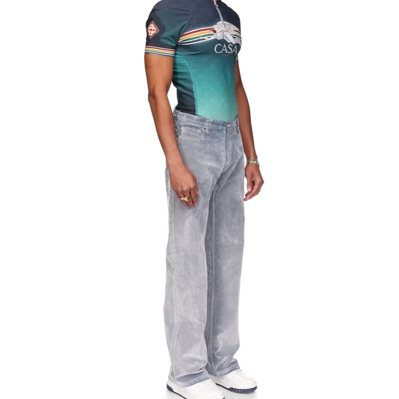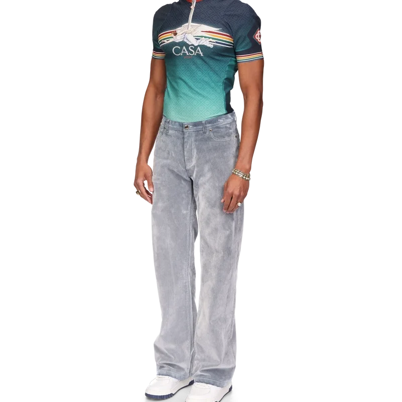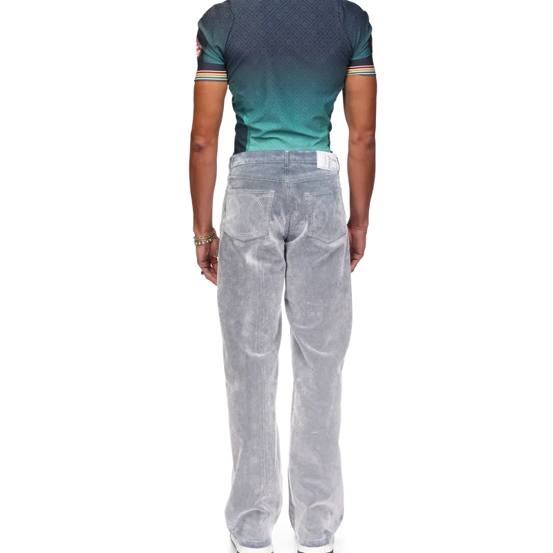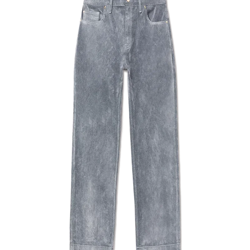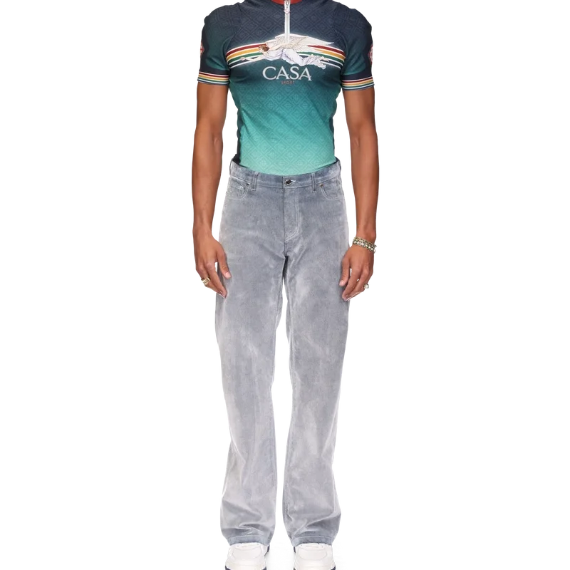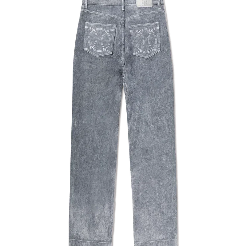 Blugii cu textură de piersică au un design cu croi drept, fiind confecționați dintr-un material din amestec de bumbac. Prezintă accesorii metalice placate cu aur cu sigla mărcii, închidere cu fermoar, buzunare față și spate, o aplică din piele cu sigla mărcii și bucle pentru curea.