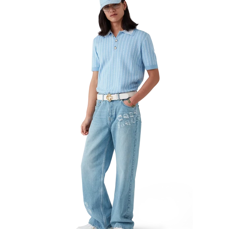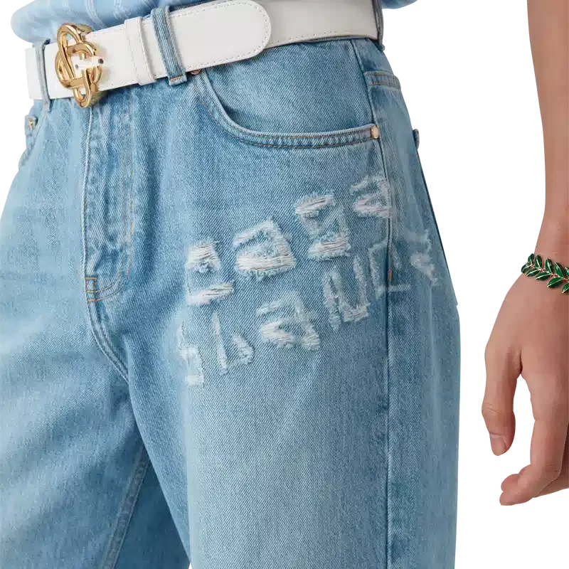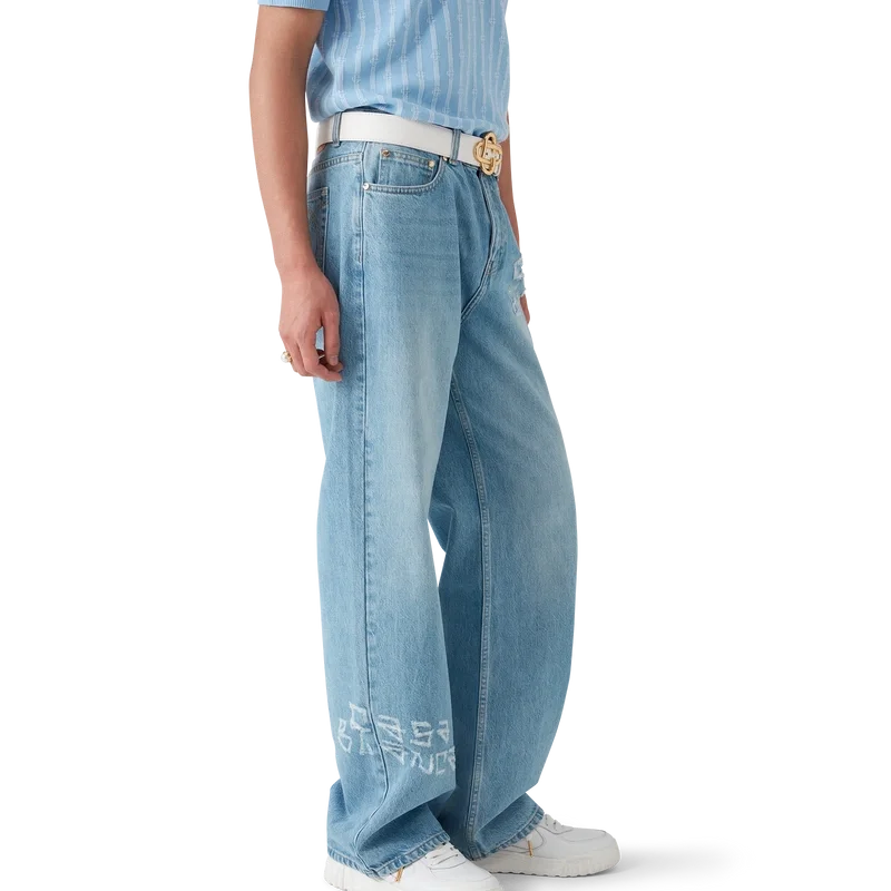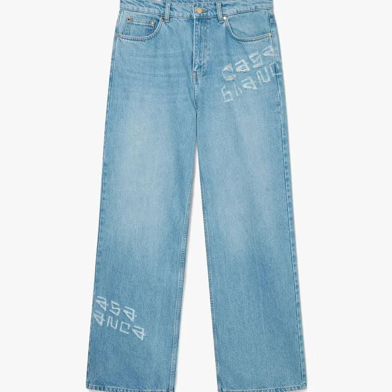 Blugii din denim cu aspect uzat și grafite sunt un model cu croială dreaptă, confecționați din țesătură de bumbac și prezintă logo-ul suprapus caracteristic, în stil grafit, gravat în țesătură. Sunt completați cu accesorii placate cu aur, bucle pentru curea, buzunare față și spate, o emblemă din piele cu sigla mărcii și închidere cu fermoar.