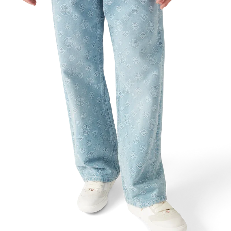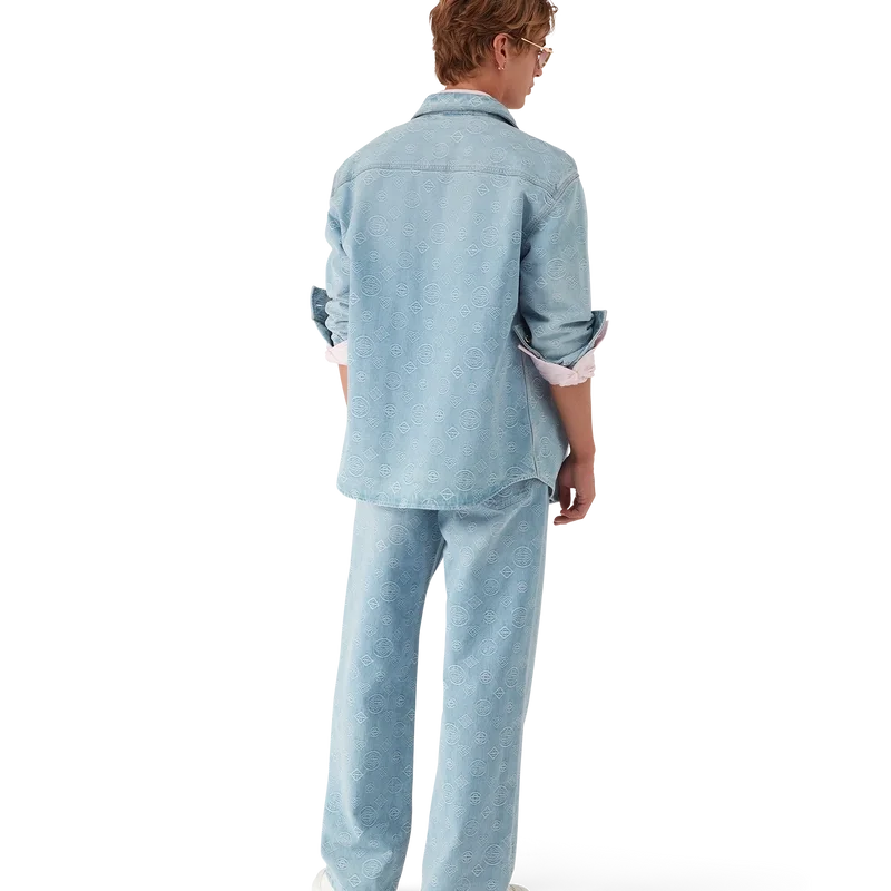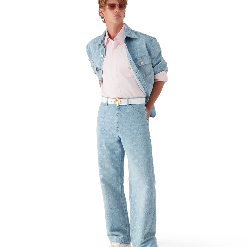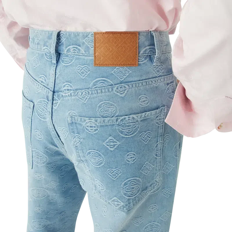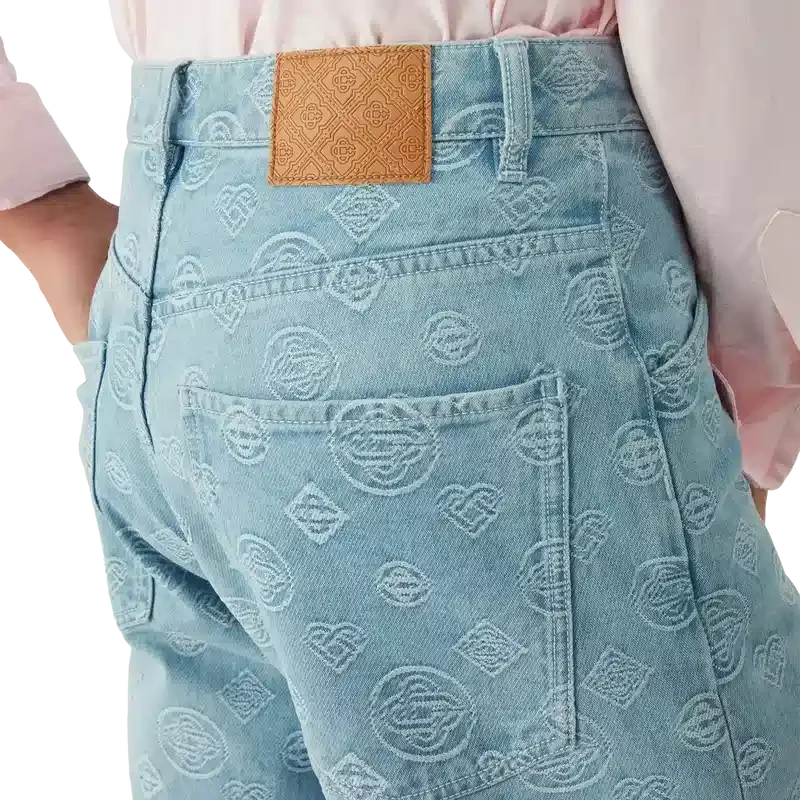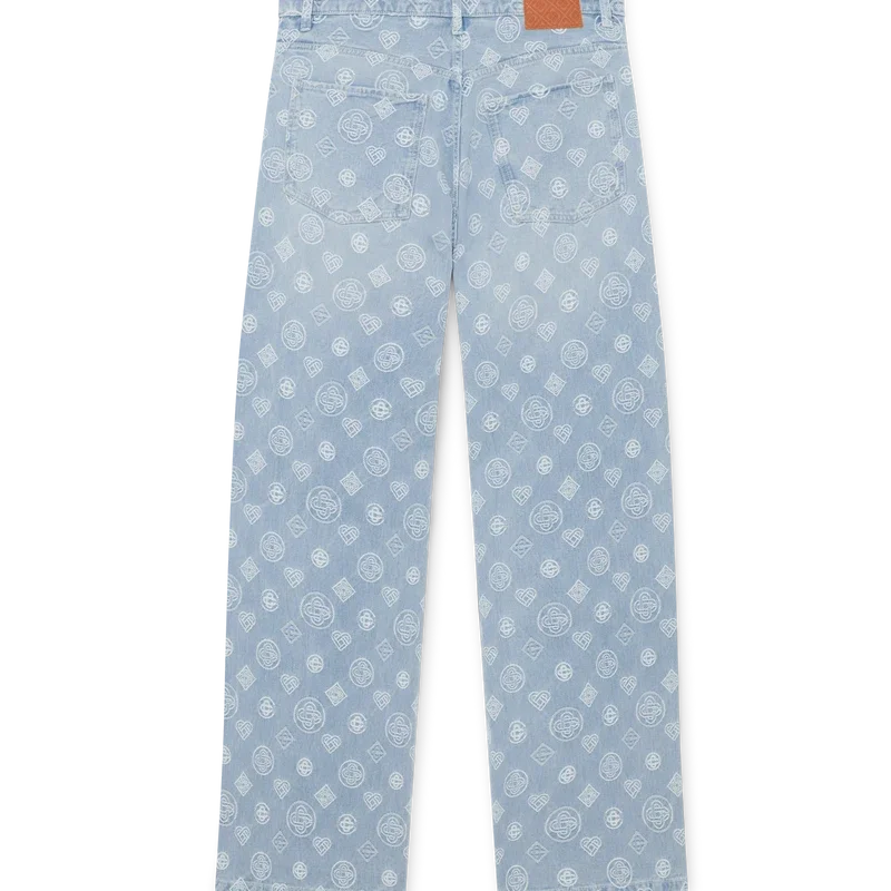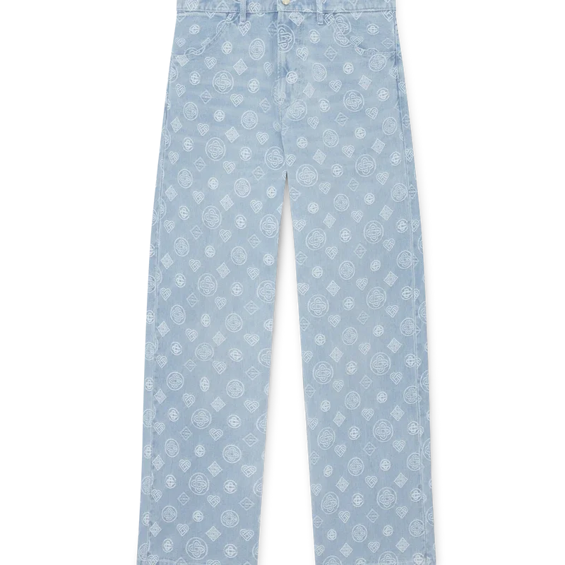 Blugii din denim cu monogramă și croială lejeră au un design clasic cu picior drept, prezentând logo-ul Honeydew al casei repetat. Acest model repetat diferă de celelalte monograme ale noastre, deoarece combină forme unice pentru a forma un model coerent. Completați cu bucle pentru curea, închidere cu fermoar, buzunare înclinate, buzunare aplicate în spate și accesorii placate cu aur.