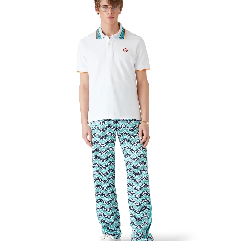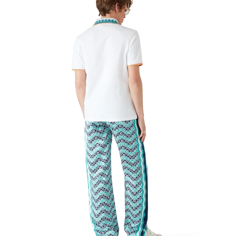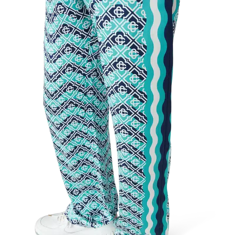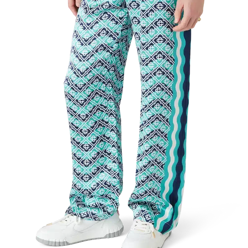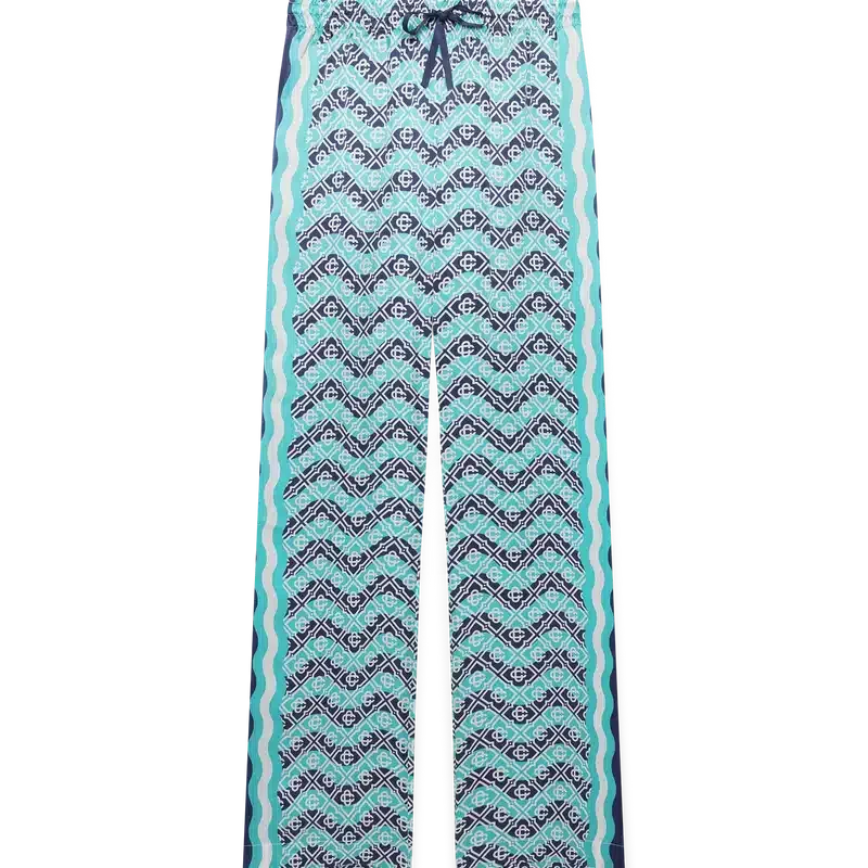 Pantaloni din mătase Monogram Wave sunt un model imprimat integral cu monograma semnătură a casei, confecționați dintr-o țesătură de satin de mătase. Prezintă o bandă elastică în talie, închidere cu șnur, detalii cu dungi inspirate de Memphis Wave pe părțile laterale și buzunare laterale în cusătură.