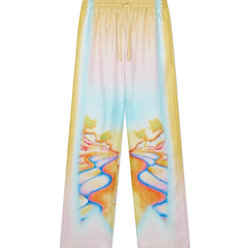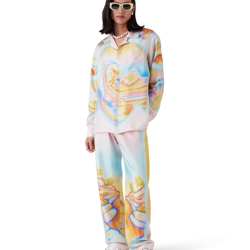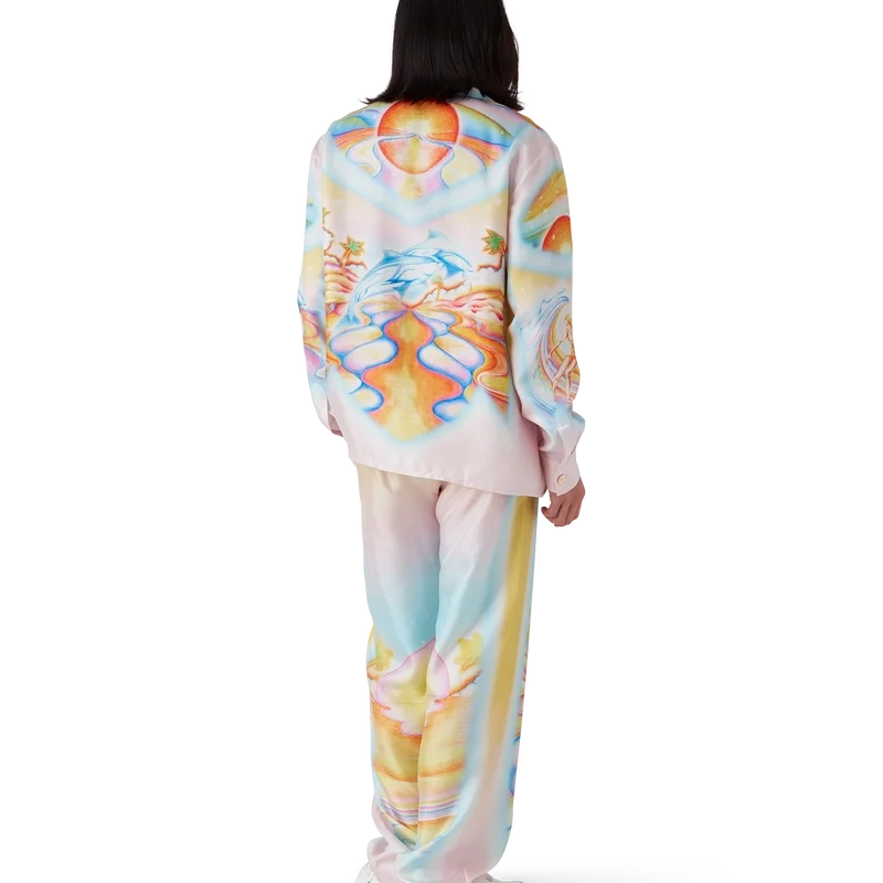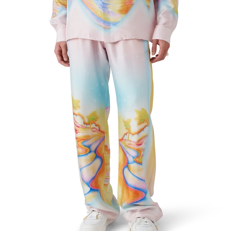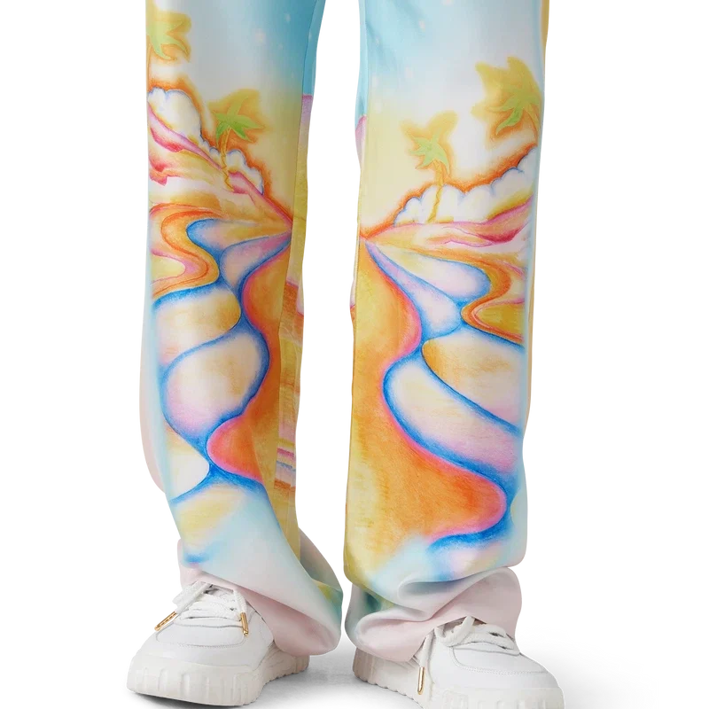 Pantaloni din mătase „Psychedelic Nirvana” prezintă un imprimeu pe toată suprafața, confecționați din țesătură de mătase în diagonală, cu un motiv inspirat de plăcile de surf californiene din anii ’70, realizate cu aerograful în culori pastelate, care conferă imprimeului o atmosferă aproape onirică și idealistă. Prezintă talie elastică, închidere cu șnur, buzunare laterale în cusătură și un buzunar aplicat în spate.