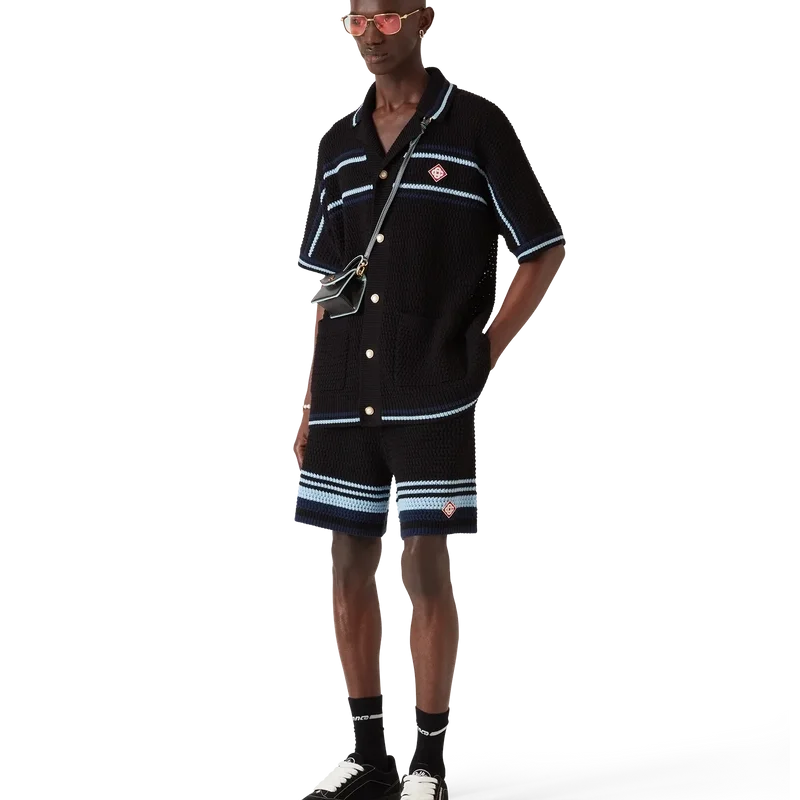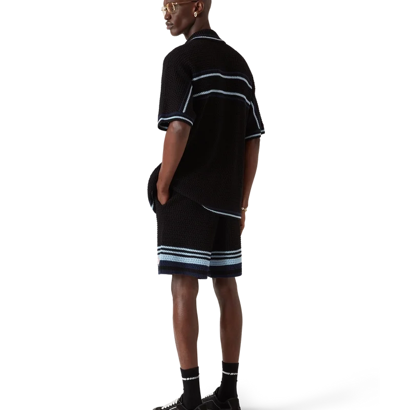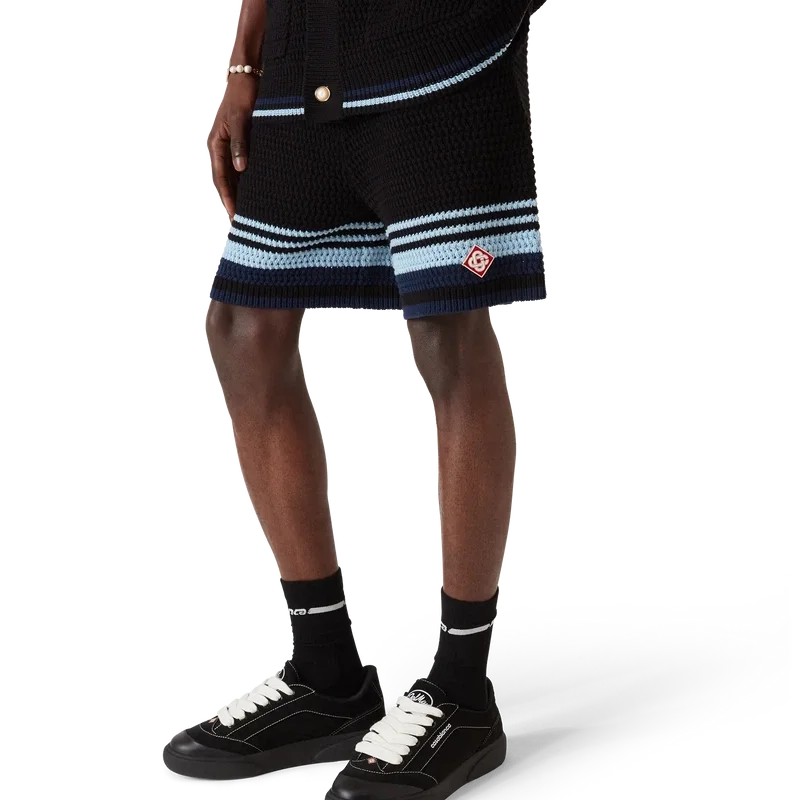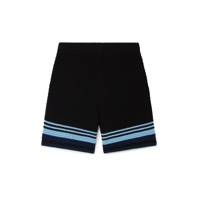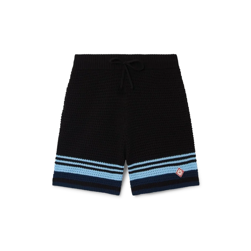 Pantaloni scurți croșetați au un design rafinat, cu textură moale, prezentând logo-ul diamant caracteristic casei. Finisați cu o bandă elastică cu nervuri la talie, cu închidere cu șnur, buzunare laterale, detalii cu dungi contrastante pe picioare și o siluetă relaxată.