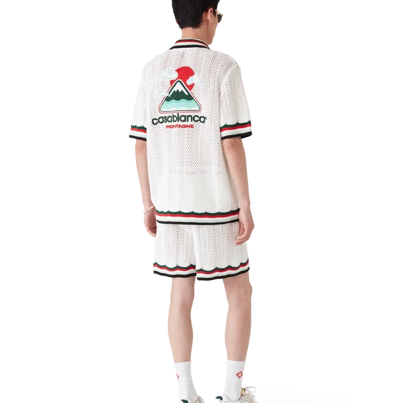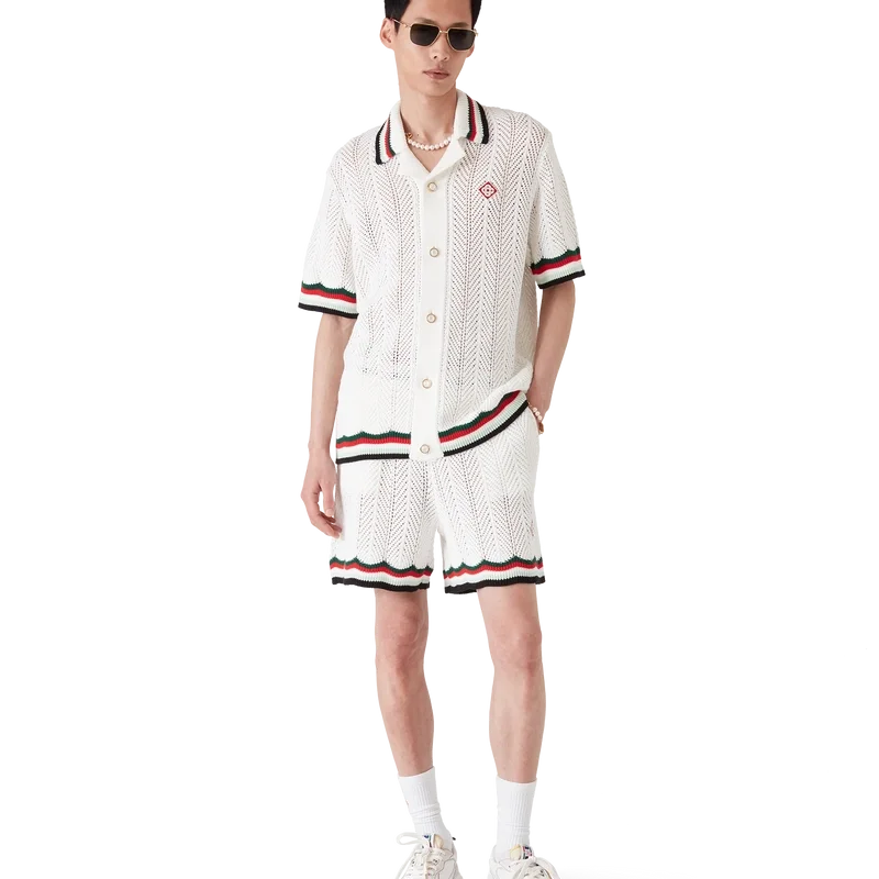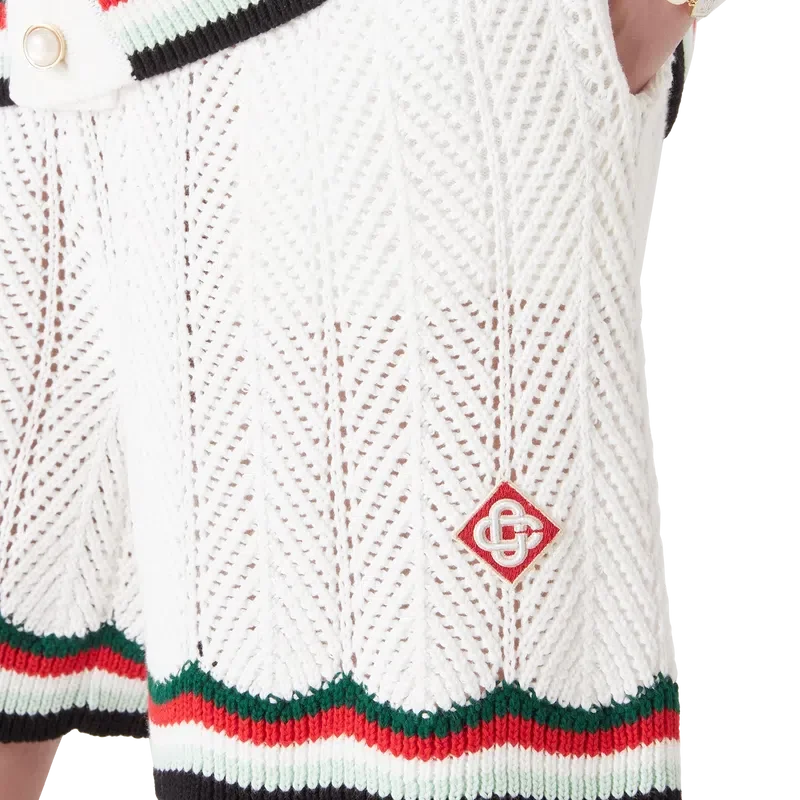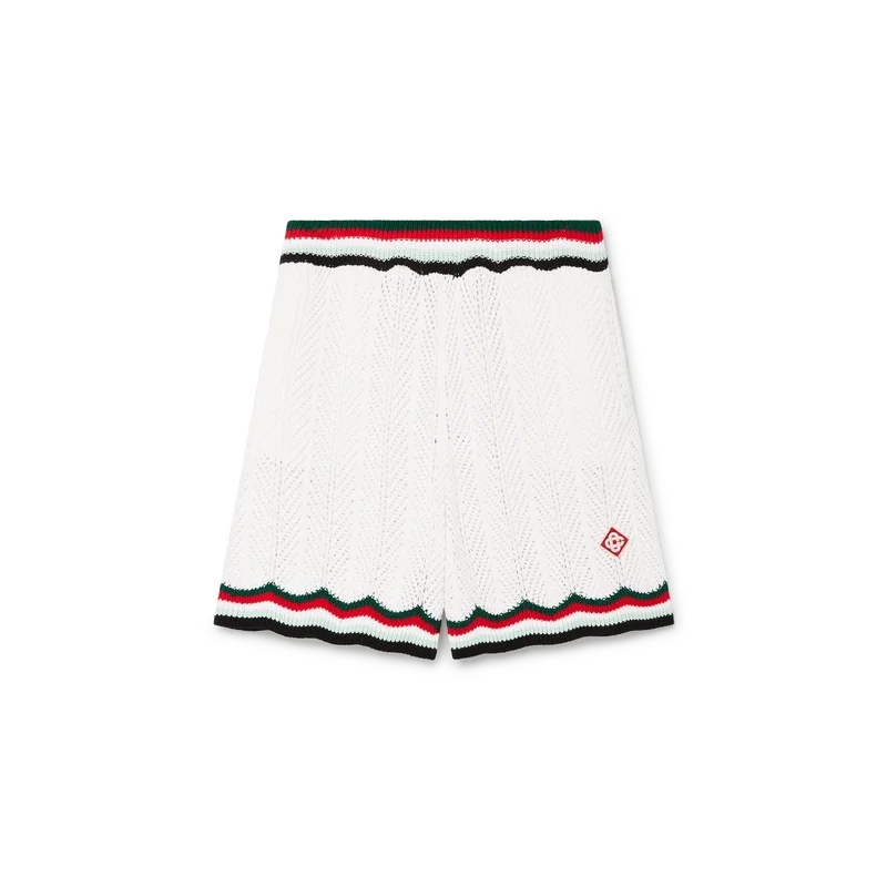 Pantaloni scurți croșetați cu model Chevron au un design clasic, fiind confecționați dintr-un material din bumbac croșetat cu model Chevron și logo-ul în formă de diamant, specific casei de modă. Sunt prevăzuți cu o bandă elastică în talie, buzunare în cusătură și detalii cu dungi la tiv și bandă.