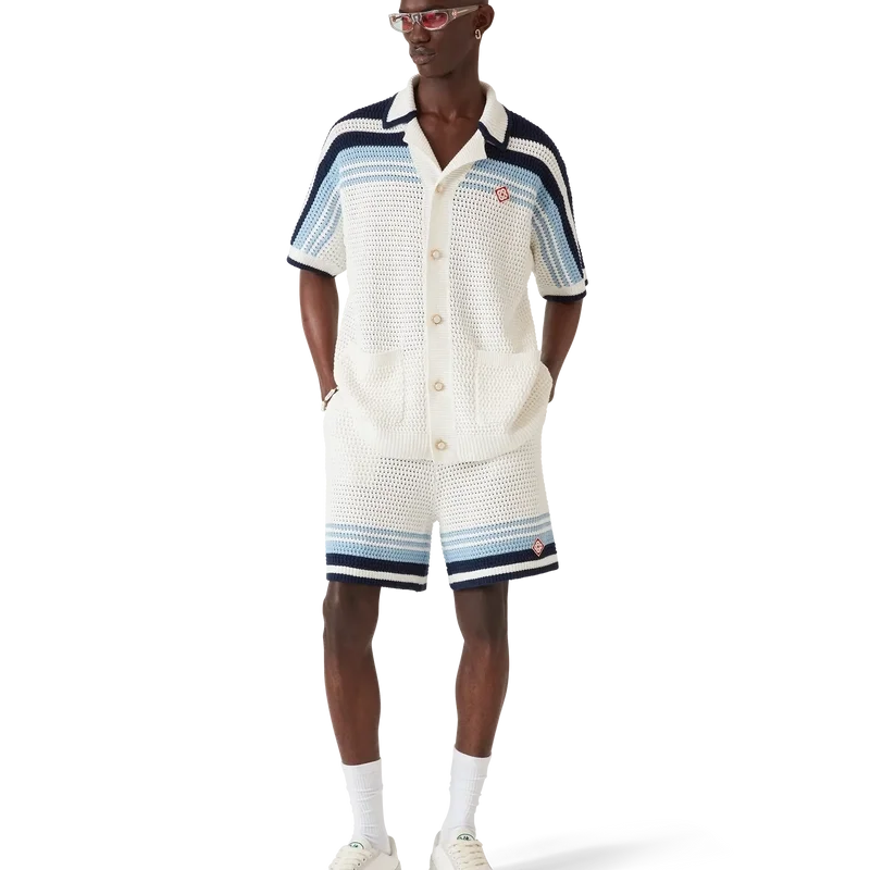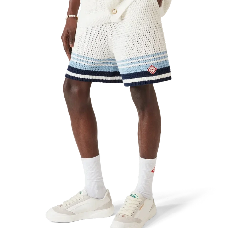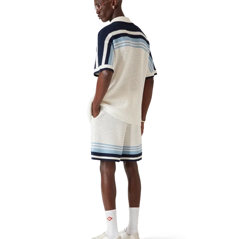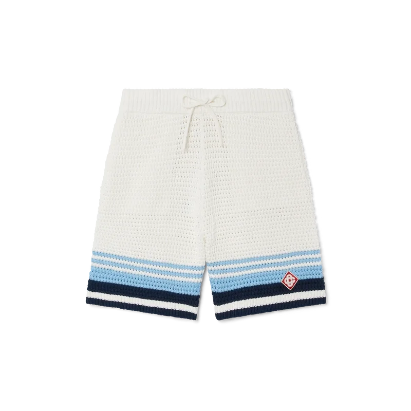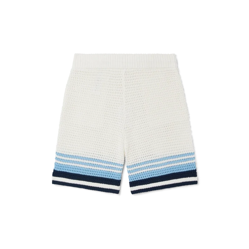 Pantaloni scurți croșetați au un design rafinat, cu textură moale, confecționați dintr-o țesătură de bumbac croșetată, prezentând designul caracteristic cu dungi de tenis în culori naturale, care formează un efect de gradient.