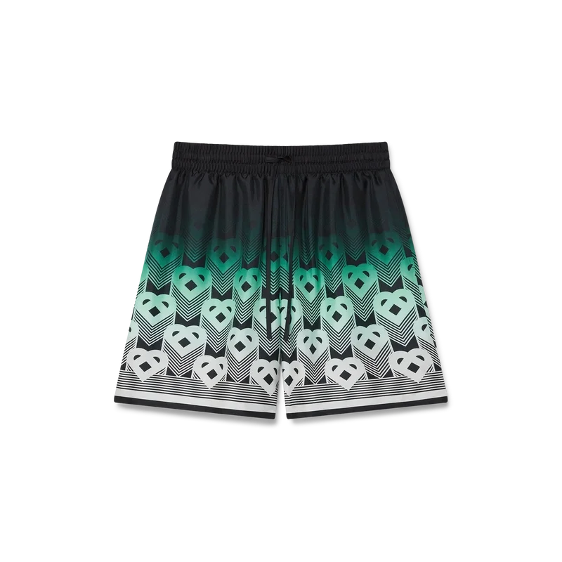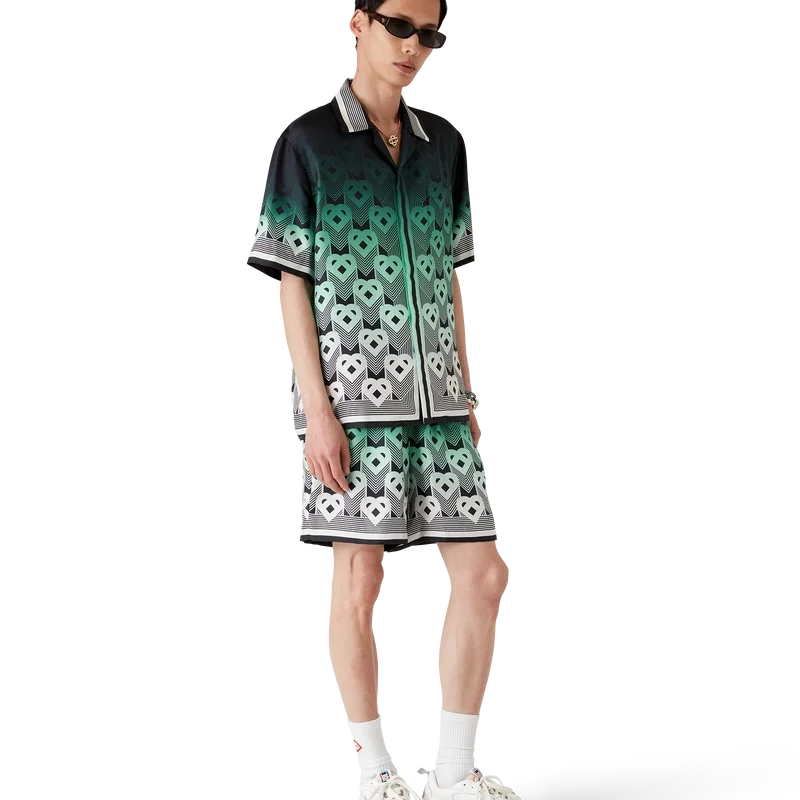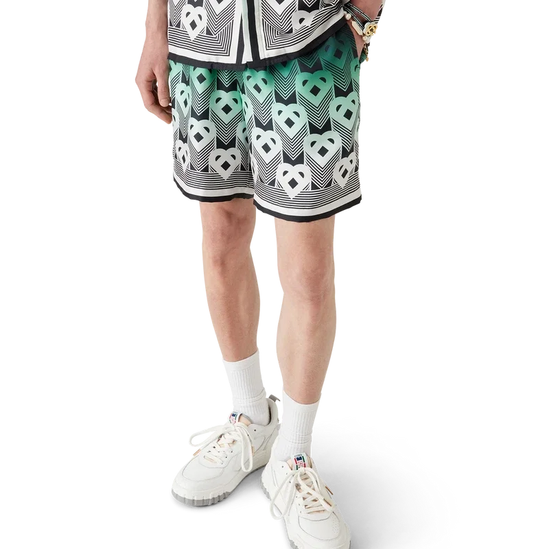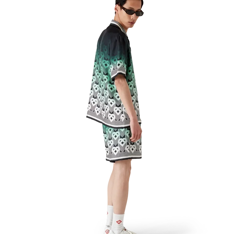Pantaloni scurți din mătase cu monogramă în degrade au un design imprimat pe toată suprafața, prezentând monograma în formă de inimă a casei, pe un fundal în degrade de culoare mentă, care utilizează paleta de culori a hotelului Park Hyatt – un hotel iconic din Tokyo care folosește mentă și negru în designul interior – confecționați dintr-o țesătură de mătase twill cu monogramă.